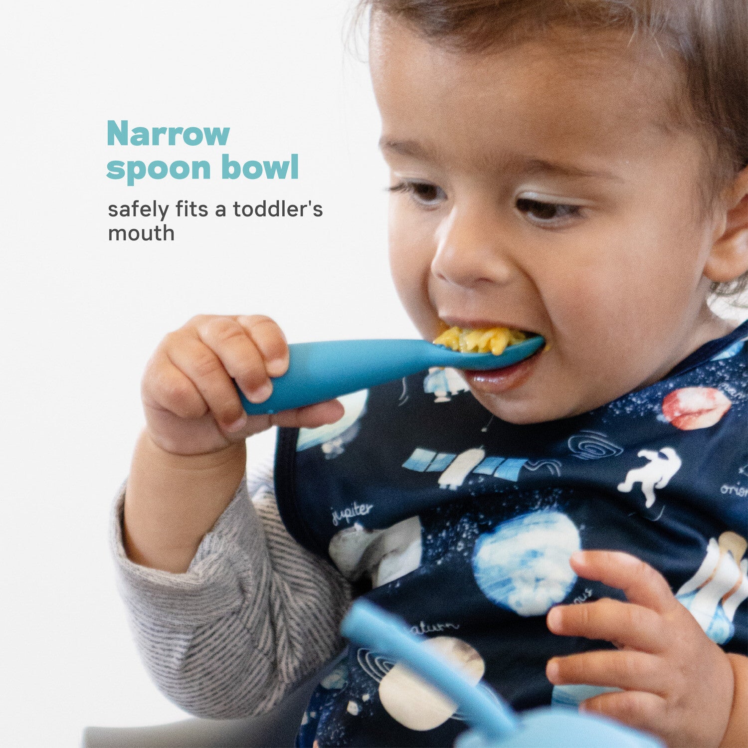 - Narrow spoon bowl / fork prongs safely fit toddler’s mouth