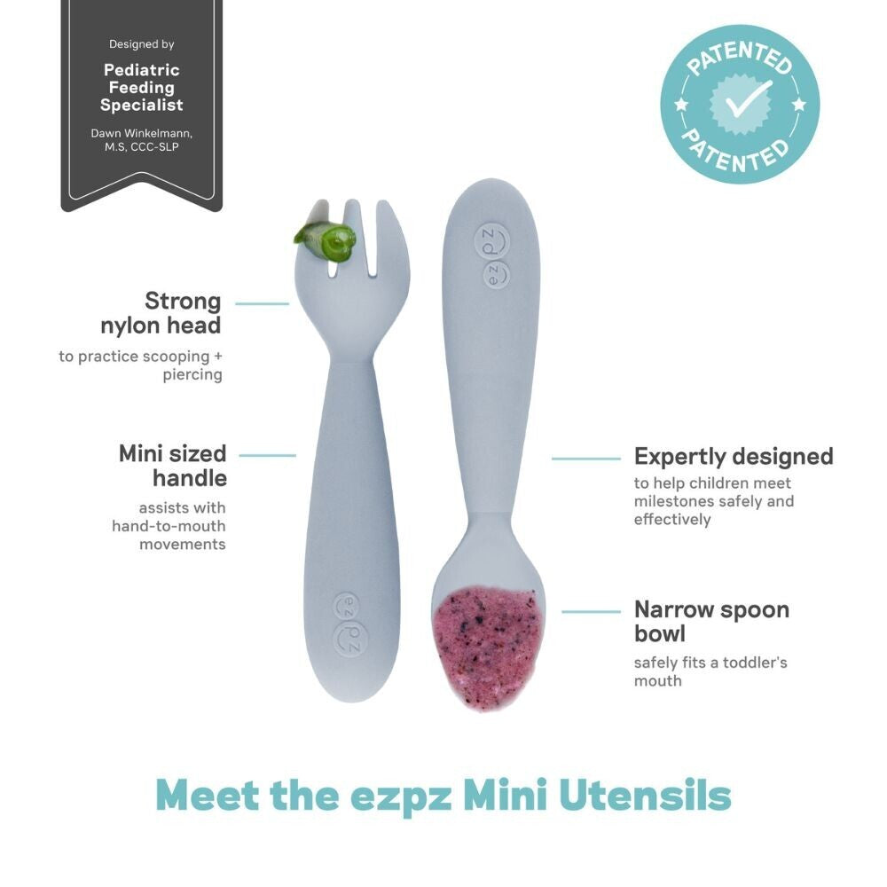 Learning to self-feed is an important developmental milestone, and the ezpz Mini Utensils are designed to help toddler learn how to eat with a spoon (scooping) and fork (piercing). The Mini Spoon and Fork are the most functional, developmentally appropriate toddler utensils on the market.