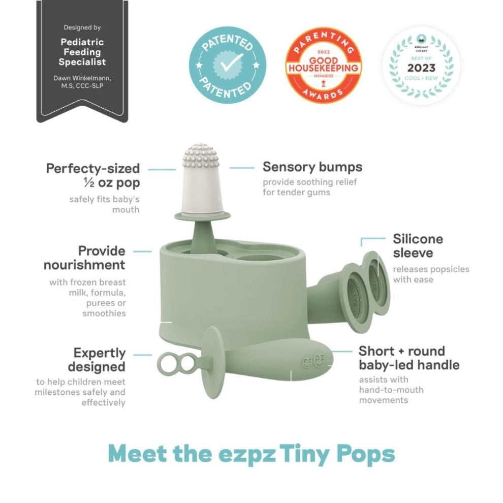 Finally, a popsicle mold made for infants! ezpz Tiny Pops are portion-sized at ½ oz and have a short, fat, round handle for baby’s grasp. To use, simply freeze breast milk, formula or a smoothie for 4+ hours and (voila!) your baby has nourishment and a treat for their senses!