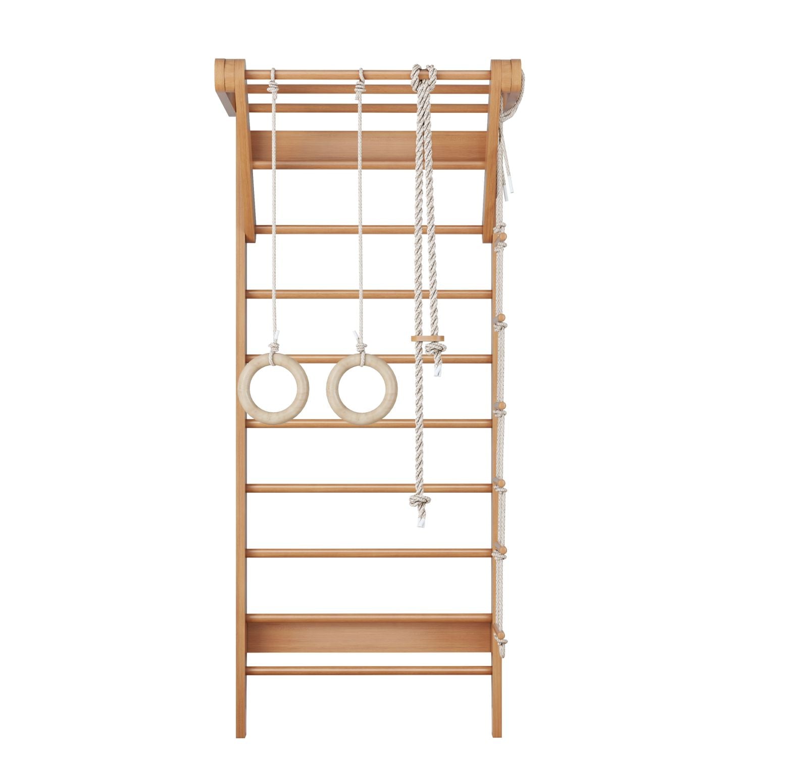 Inlcudes 1 solid high grade beech plywood & beech wood ladder gym, 3 additional accessories: gymnastic rings, rope ladder, monkey rope.