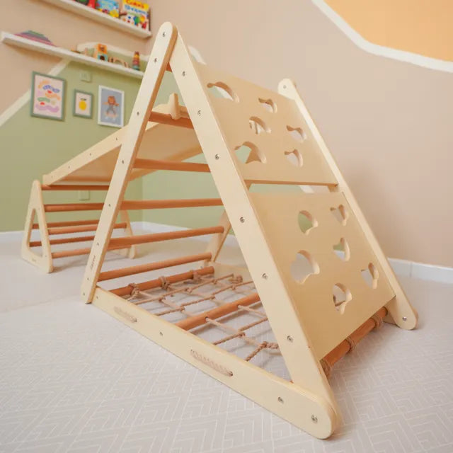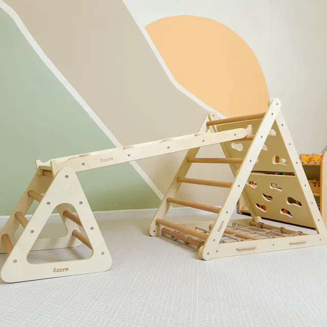 Introducing the Ezzro Natural Pikler Triple Side Triangle w/ Toddler Climber Pikler a versatile and engaging Montessori-inspired climbing toy designed to grow with your child. This set includes a Natural Pikler Triple Side Triangle w/ Toddler Climber Pikler, a reversible ramp slide, and toddler climbing pikler to encourage active play and development. The Ezzro Natural Pikler Triple Side Triangle w/ Toddler Climber Pikler offers a sturdy climbing structure with three sides, each providing different climbing challenges to help develop motor skills, balance, and coordination.
