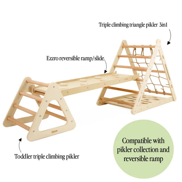 - This set includes a Natural Pikler Triple Side Triangle w/ Toddler Climber Pikler, a reversible ramp slide, and toddler climbing pikler to encourage active play and development.