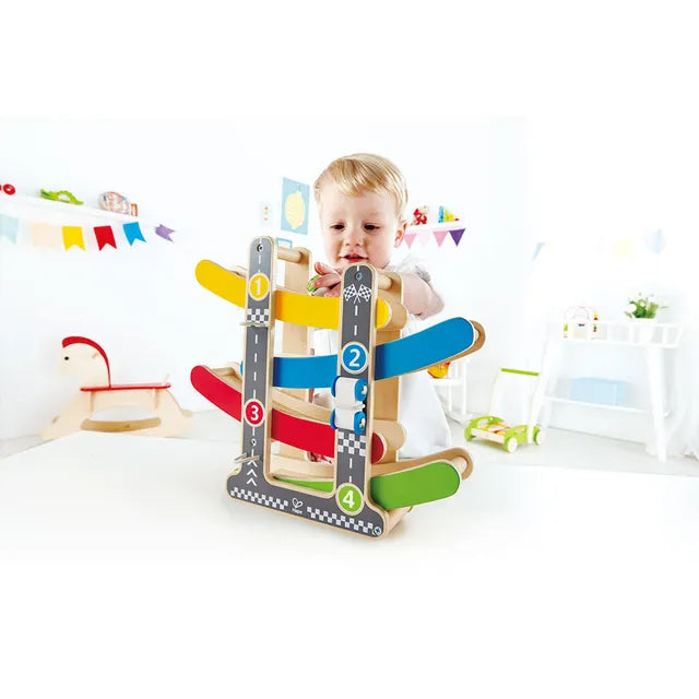 Fast Flip Race Track - Wooden Racetrack with 3 Speedy Race Cars, Parking Spots, and Road-Racing Details Screen. Watch your race cars flip over one another as they come racing down!