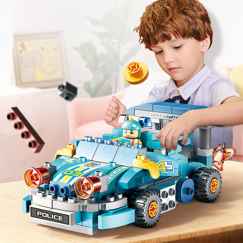 Two Builds, Endless Fun: The primary model is a sleek, oversized Police Car featuring striking blue and white colors, racing decals, large durable wheels, and fun details like mock thrusters and a prominent spoiler stamped with ""BRAINPOWER."" The second build transforms the same pieces into two unique Robot Warriors ready for patrol. This innovative design stimulates creativity, spatial reasoning, and complex problem-solving as children learn to see individual parts as components for multiple structures.
