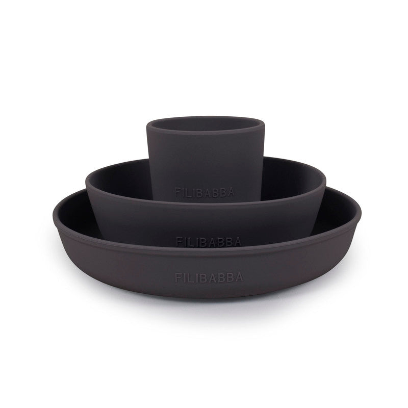 Super fine silicone set which consists of a cup, bowl and a plate. Nice medium-sized cup that fits many sizes of children's hands, as well as both a bowl and a plate with a suction cup under the bottom. The suction helps to keep the product in place, so you avoid too much spillage. The set is made of 100% silicone with a soft surface, which both gives a comfortable feeling to hold on and at the same time makes it easy for the child to use our cutlery around the bowl or plate. It is the ideal set for a family with children where you want it to look nice, but at the same time be practical. Therefore, the product can withstand falling to the floor. When it has to go fast, our silicone series withstands oven, microwave and dishwasher. The set is also an obvious option as a gift.