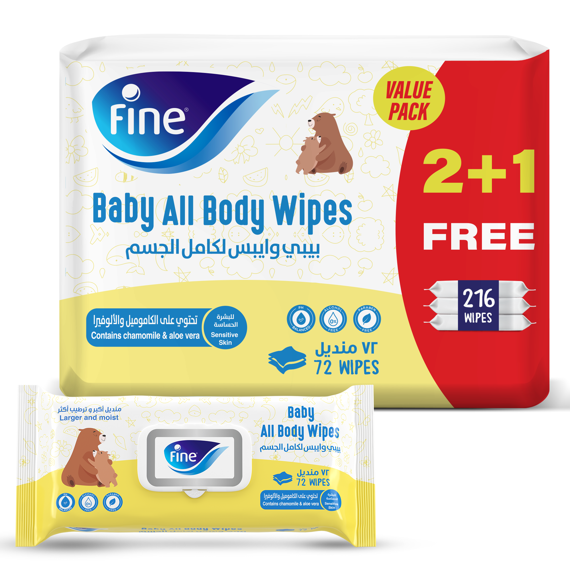 Wipe away the messes and worries. Fine Baby All Body wipes offer effortless full-body cleaning with their larger size, ensuring thorough cleansing with just one wipe. Enriched with chamomile and aloe vera essence, these wipes provide natural and soothing moisturization, making them ideal for sensitive skin and leaving it soft and nourished. They are free from harmful chemicals, including alcohol and parabens, ensuring your baby's skin remains free from irritants. These wipes are also pH balanced, maintaining your baby's skin health, and are conveniently available in 72-pull packs for easy storage and accessibility, whether you're at home or on the go, making them a reliable choice to keep your baby clean and comfortable.