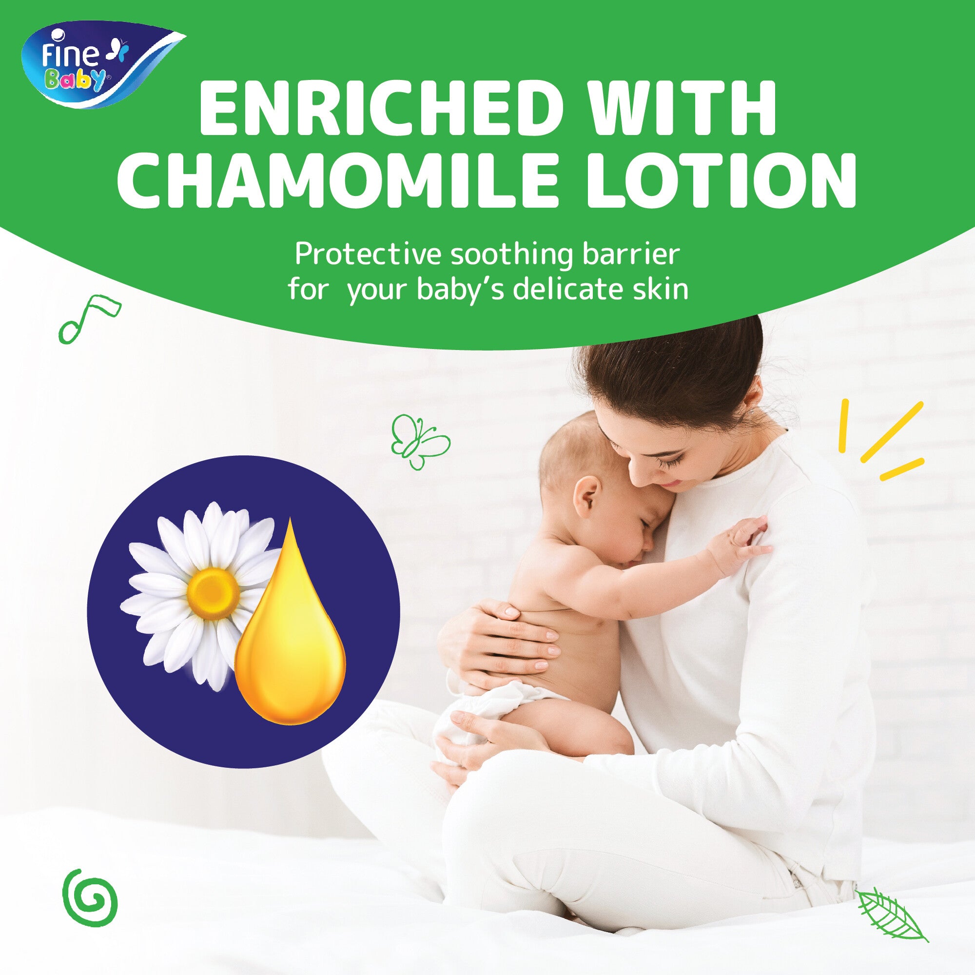- CHAMOMILE LOTION COTTONY SOFT DIAPERS: Fine Baby diapers are enriched with a gentle chamomile lotion that acts as a protective and soothing barrier for your baby's delicate skin. With the cottony soft texture, your baby will experience tender care.