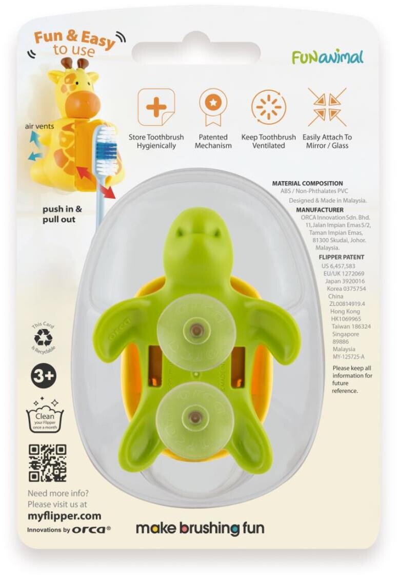 Flipper Fun Animal Toothbrush Covers – Kids Toothbrush Holder. This animal toothbrush holder allows you to store your child’s toothbrushes hygienically and upright while keeping dust and unfriendly, unwanted stuff off of the brushes. Install In a Flash - Our suction cups will hug your mirror, glass or smooth tile & hold on tight! Also great as a shower toothbrush holder. Flipper Fun Animal fits like a glove on just about any manual toothbrush. It is also travel friendly and easily converts to a compact travel case. Just store it and stick it - wherever you go! Ready, Set, Go! - Tooth brush covers, always ready to travel. Maintaining The Magic - Be kind to your Fun Animal Flipper! At least once a month, wash with mild soap & water, then rinse and wipe dry. Can use an old brush for gentle cleaning. Whether this is your children’s first toothbrush, a toddler toothbrush or toothbrushes for the whole family, Flipper has a style for you. We’ve inspired 20 million smiles since 1999, selling in over 40 countries.