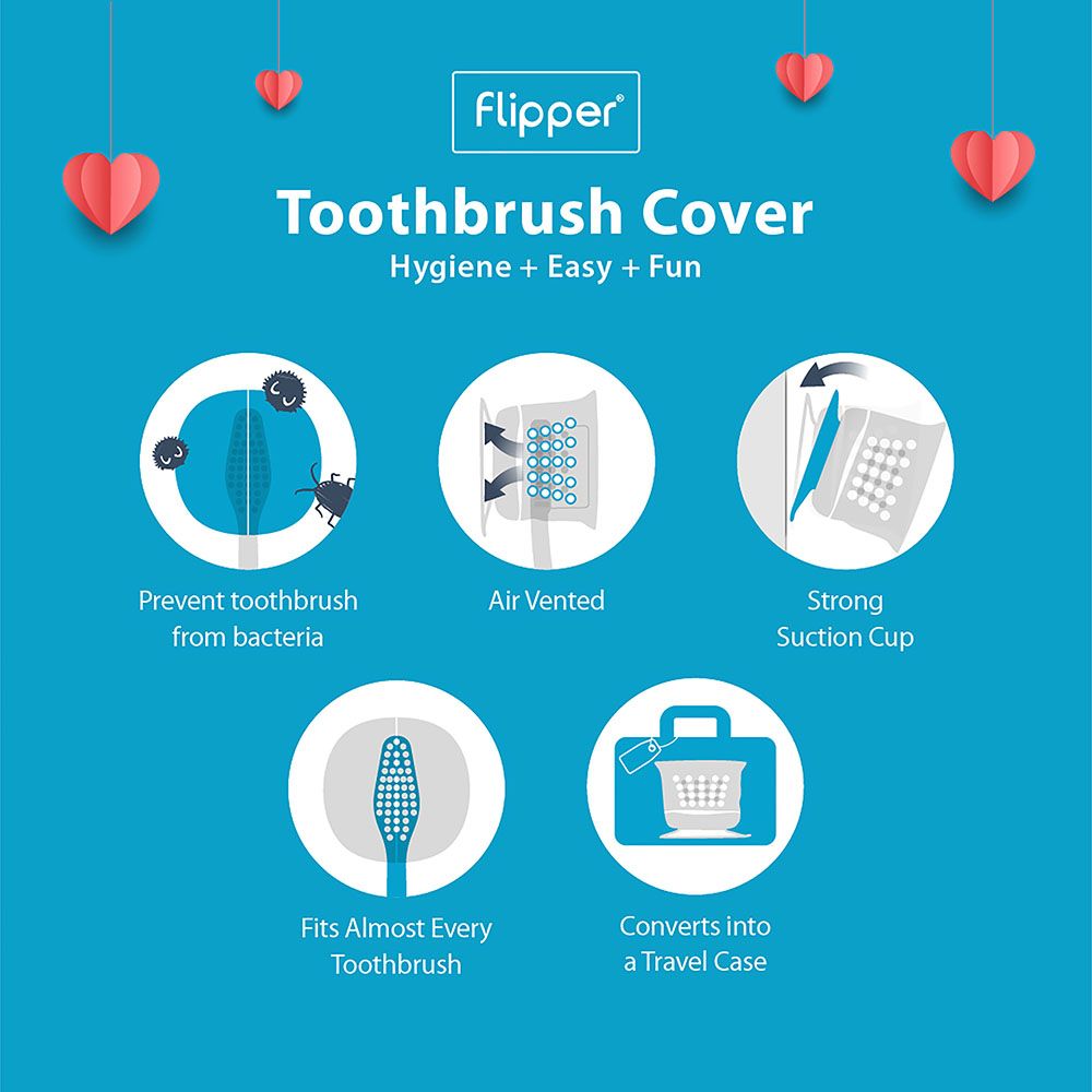 Flipper - the world's first, self-opening and closing toothbrush cover mechanism with hygiene, easy and fun in mind since 1999. With the patented mechanism, Flipper has brought smiles to 30+ millions (and still growing) happy users. Do You Know? Leaving the toothbrush without protection in the bathroom will certainly increase the risk of infection. Bacteria and viruses that spread when you flush water will survive in the air long enough to linger on bathroom surfaces. Store Your Toothbrush Hygienically Stop cross-contamination by separation now, our protective cover safely keeps your toothbrush free of germs, dust, bugs and other yucky stuff. Open & Close with One Touch The unique mechanism design allows Flipper to open / close automatically in response to the tug / push of the toothbrush. Best Brushing Companion for All Ages Turn wiggles into giggles! Learn good oral hygiene habits when they are young, Flipper is a good buddy to make brushing fun.