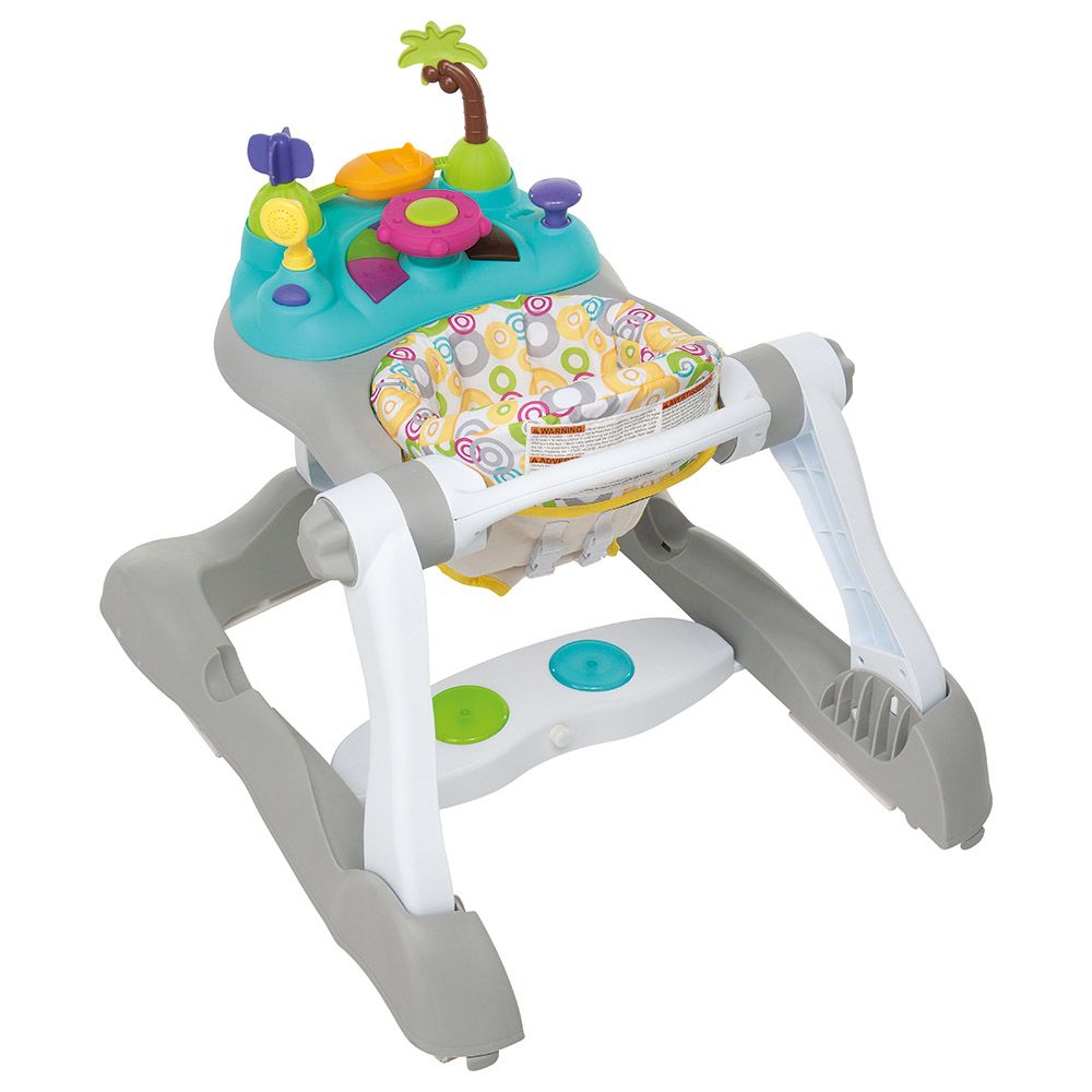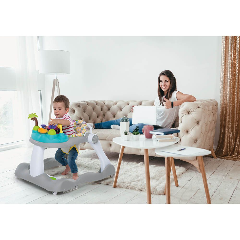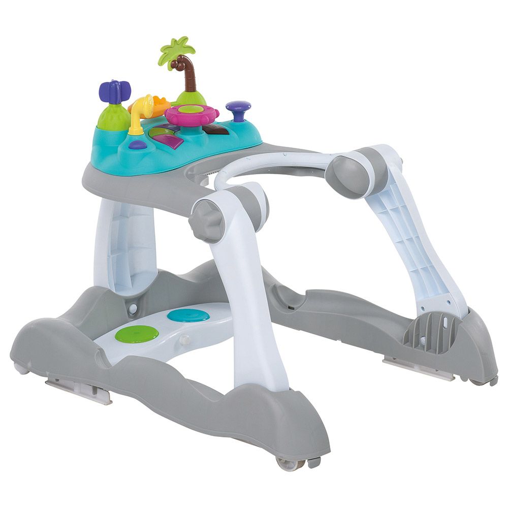 Equipped with a large feeding tray, with a removable toy tray. It is foldable, adjustable in height and equipped with safety device to prevent access to stairs and steps. The musical footboard is adjustable. Equipped with 4 wheels, 2 of which are swivelling.
