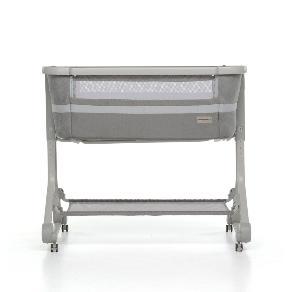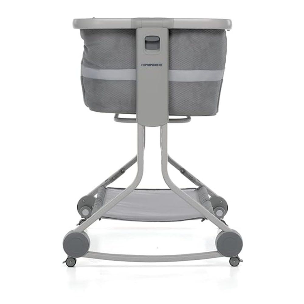 The crib has a side that can be opened for co-sleeping and the height is adjustable to 6 independent positions, with anti-reflux function. The aluminium frame is lightweight and easy to move around, thanks to the 4 swivelling rubber wheels with brake: by rotating the wheels 180°, the crib can convert into a rocking crib.