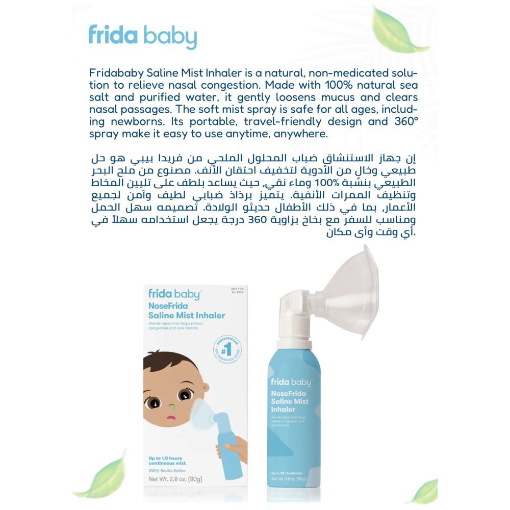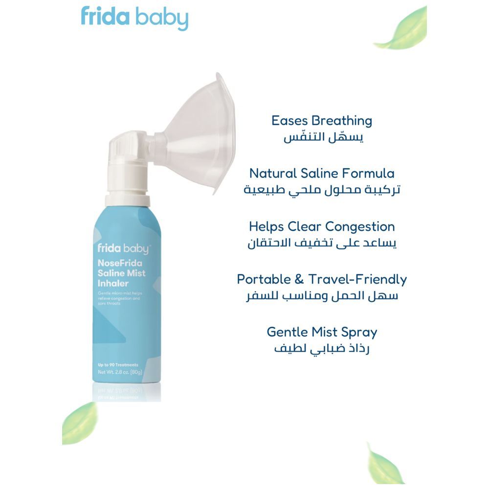 - COMPREHENSIVE RELIEF: Expand your options to address your baby's respiratory discomfort. Frida's congestion portfolio now includes the NoseFrida Saline Mist Inhaler, which targets the upper respiratory tract to soothe the throat and alleviate congestion.