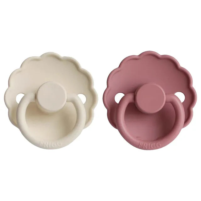 The Frigg Daisy pacifier with scalloped edges that mimic flower petals is the essence of elegant design. The flowery and modern details catch the eye of every style-conscious mother. That makes Frigg the perfect fit for today's mothers who attach great importance to classic designs with modern twists when choosing baby essentials. , , Frigg Daisy is available in two sizes: , Size 1: Nipple is 27 mm and is recommended for ages 0-6 months. , Size 2: Nipple is 30 mm and is recommended for ages 6-18 months.