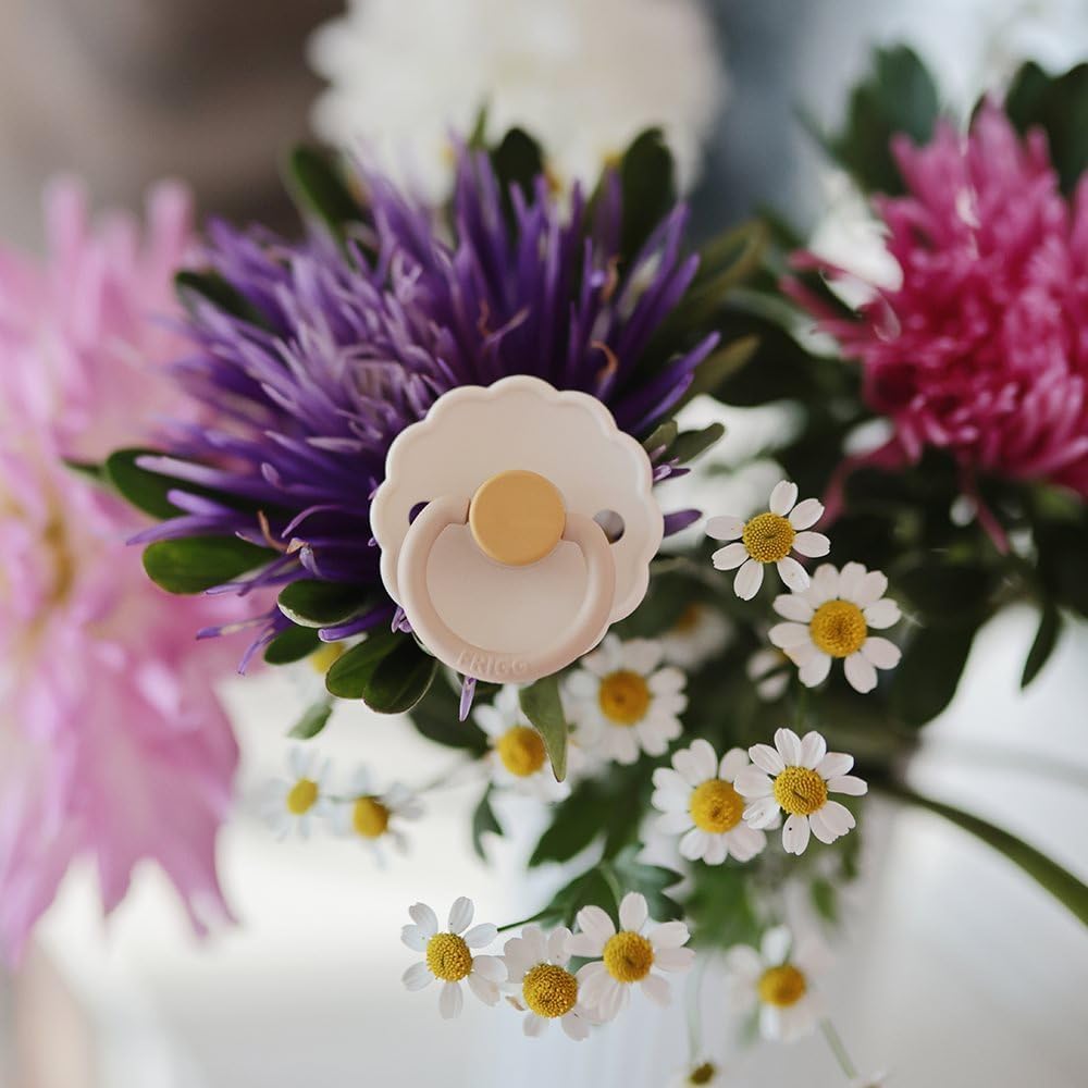 FRIGG 4-pack Snowflake Dream contains: 1 pc. FRIGG Daisy round pacifier in the color: Cream, 1 pc. FRIGG Daisy round pacifier in the color: Chamomile, 1 pc. FRIGG Fairytale round pacifier in the color: The Ugly Duckling (Cream), 1 pc. FRIGG Fairytale round pacifier in the color: The Emperor's New Clothes (Silky Satin)