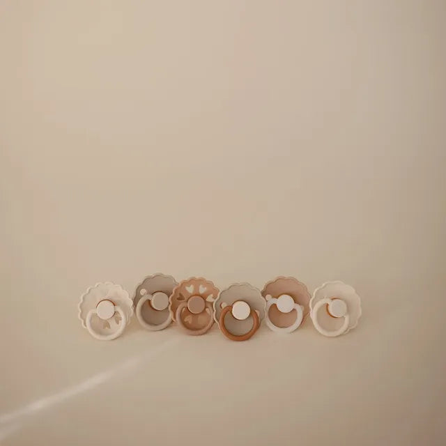 FRIGG 6-Pack Cinnamon Charm contains: 1 pc. FRIGG Fairytale round pacifier in the color: The Emperors New Clothes (Silky Satin), 1 pc. FRIGG Daisy round pacifier in the color: Cream, 1 pc. FRIGG Daisy round pacifier in the color: Desert, 1 pc. FRIGG Daisy round pacifier in the color: Sandstone, 1 pc. FRIGG Daisy round night pacifier in the color: Croissant Night, 1 pc. FRIGG Fairytale round pacifier in the color: The Ugly Duckling (Cream).