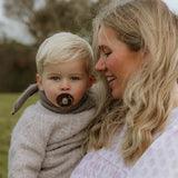 FRIGG 6-Pack Earthy Wonder contains: 1 pc. FRIGG Rope round pacifier in the color: Portobello, 1 pc. FRIGG Rope round pacifier in the color: Silver Gray, 1 pc. FRIGG Rope round pacifier in the color: Croissant, 1 pc. FRIGG Little Viking round pacifier in the color: Lagertha (Cream), 1 pc. FRIGG Little Viking round pacifier in the color: Bjorn (Cocoa), 1 pc. FRIGG Moon Phase round night pacifier in the color: Cream Night