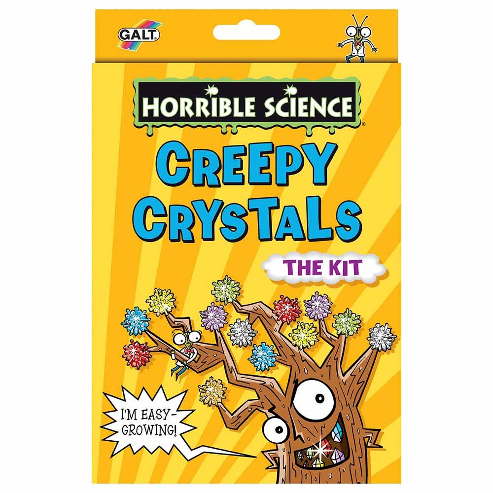 Galt Toys - Horrible Science Creepy Crystals Set to grow a creepy crystal tree, create your own diamonds and make crystals that rock! Contents: Ammonium dihydrogen orthophosphate 50g, tree growing solution, tree card, Petri-dish, colour tablet, seed crystal, round bottle, funnel, limestone rock and Horrible Info leaflet.