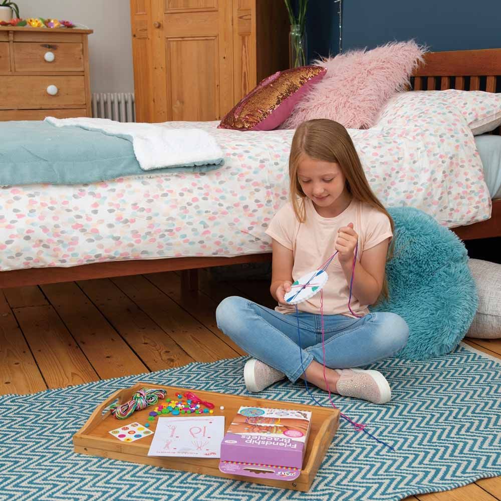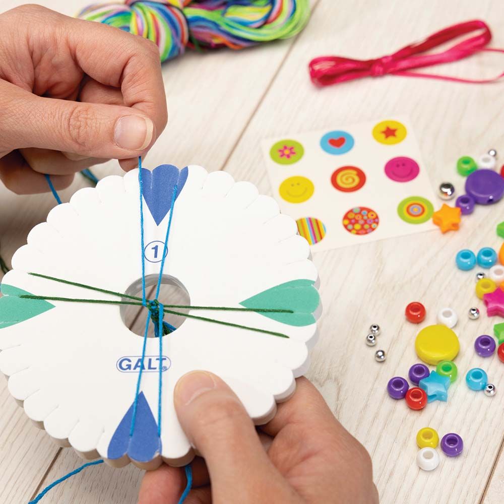 Create plaited and woven friendship bracelets with colourful threads, beads and ribbon. Make cool cord bracelets with the foam braiding wheel. Design beaded friendship bracelets using picture beads with stickers plus star, round and silver beads. Fun to wear or give to friends!