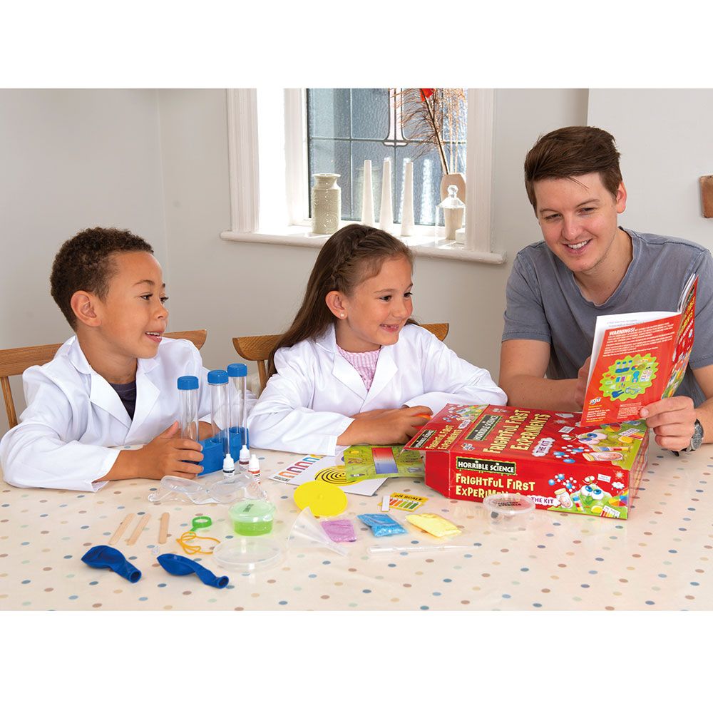 TheGalt Toys Horrible Science Frightful First Experimentsset is perfect for budding young scientists. It includes 18 frightfully foul first-time experiments. Discover how to stack lively liquids, perform eye-popping illusions and make your breakfast fly! Find out how to mix up mad molecules, learn about the shocking power of static electricity and check out gruesome guzzling plants!
