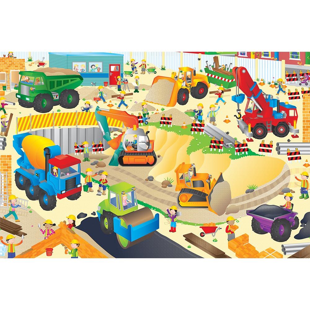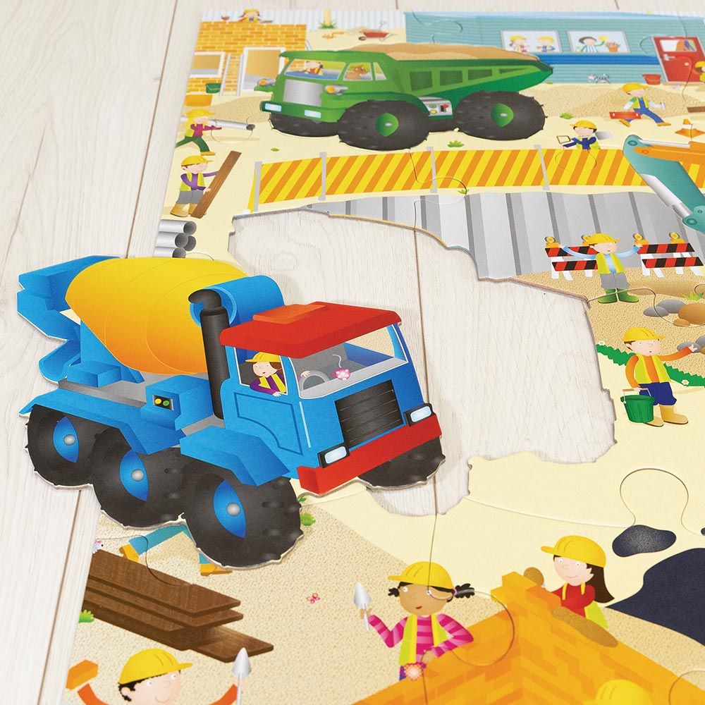 Beautifully illustrated floor puzzle with 30 pieces including 8 templates, cut in the shape of the construction vehicles. There are so many interesting things to find in this puzzle that children will return to it time and time again. The large, easy to handle pieces are made in thick board with a wipe-clean surface.