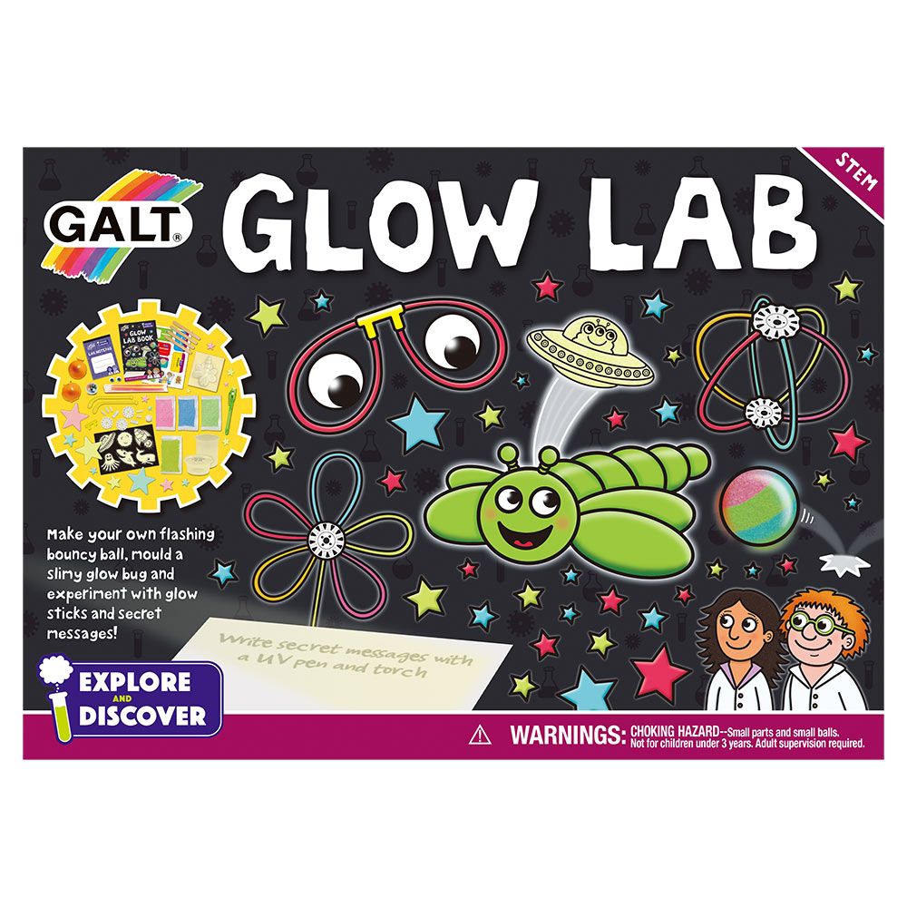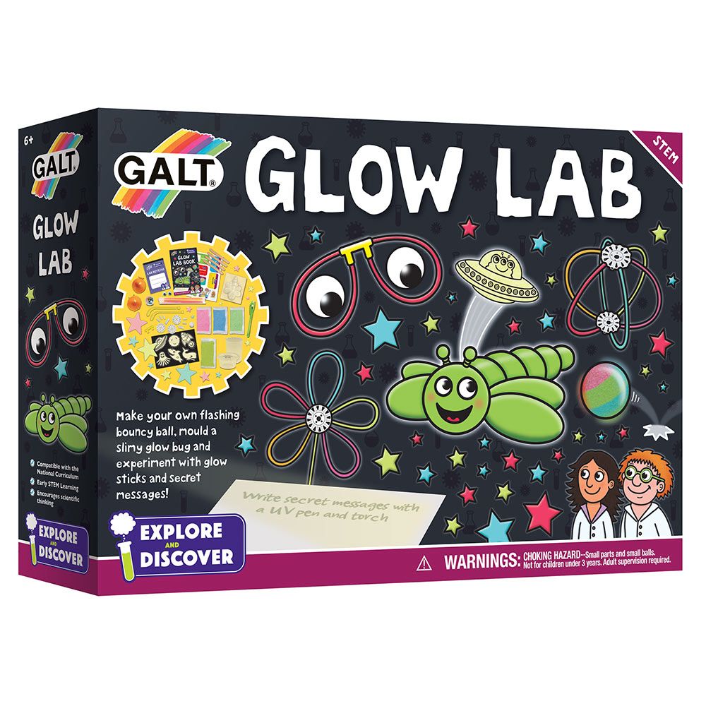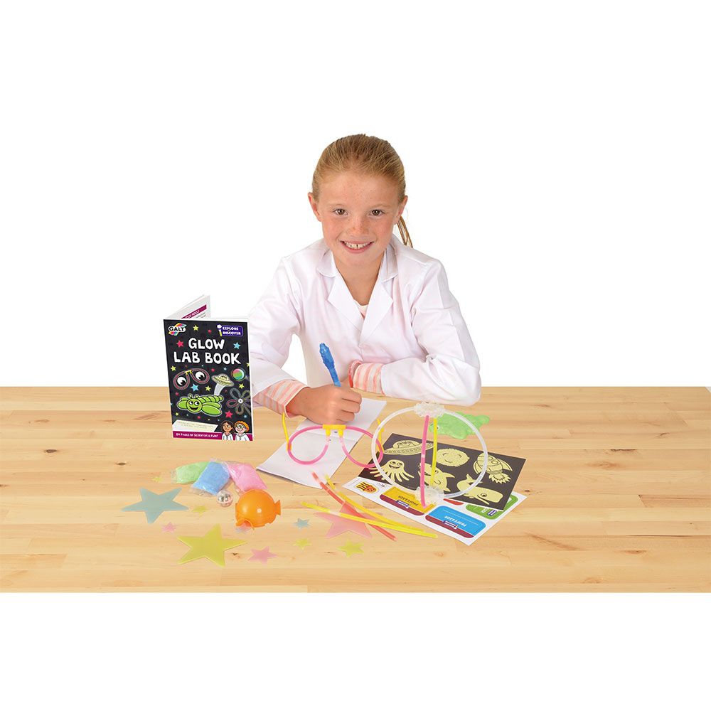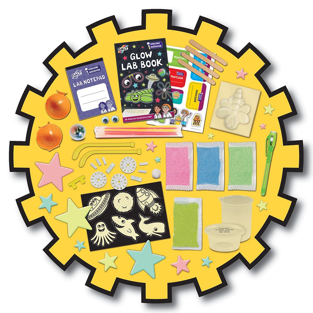 Explore and Discover Lab Kits will encourage early STEM learning and scientific thinking while having fun! A young science kit to encourage early STEM learning and scientific thinking while having fun! Experiment with glow sticks, make a flashing glow bouncy ball and reveal messages written in invisible ink! Includes a 24-page full colour lab book with 11 fun experiments. Contains 22 glow sticks and 13 connectors, UV pen with black light torch, bouncy ball mould and crystals, flashing LED capsule, glow slime powder, glow bug mould, 15 glow stars, notepad and much more.