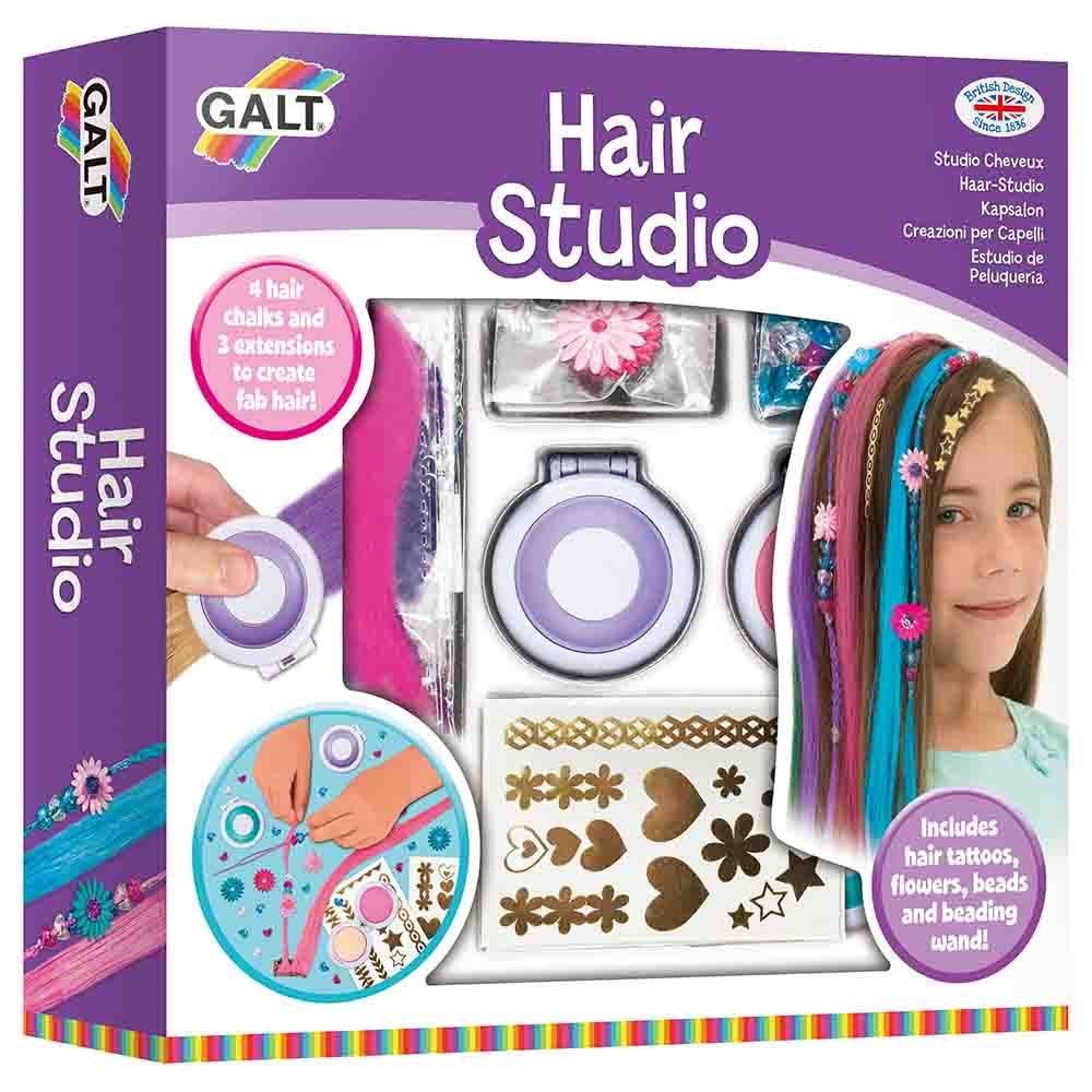 - Contents: 4 hair chalk compacts, 3 coloured hair extensions, 2 sheets of hair tattoos, 40 heart beads, 6 fabric flowers with bead, beading wand, 30 elastic bands and guide.