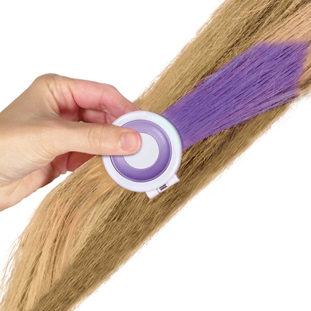 - Add coloured highlights with the hair chalk compacts and decorate with the metallic hair tattoos