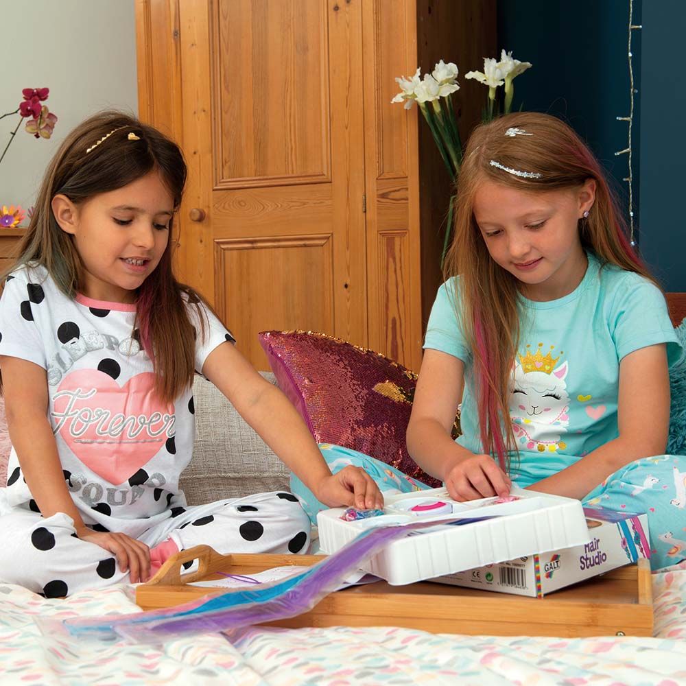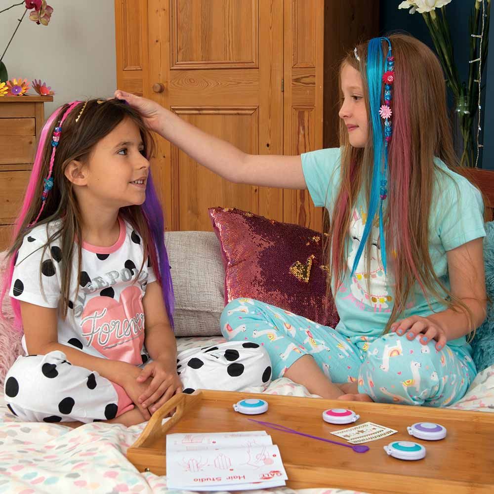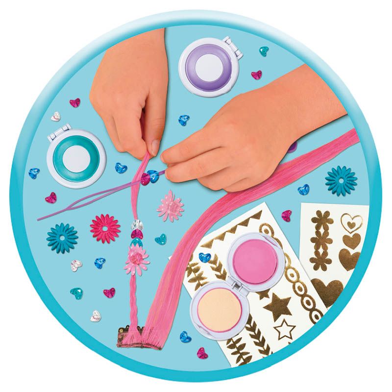 Make and wear plaited hair extensions with beads and flowers. Add coloured highlights with the hair chalk compacts and decorate with the metallic hair tattoos. Ideal for parties, sleepovers and festivals!