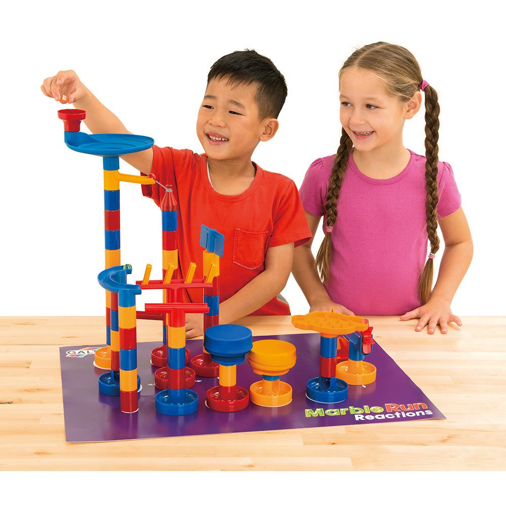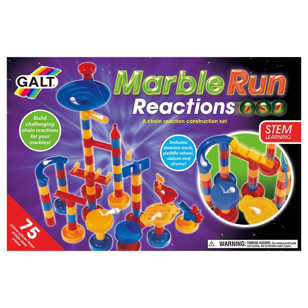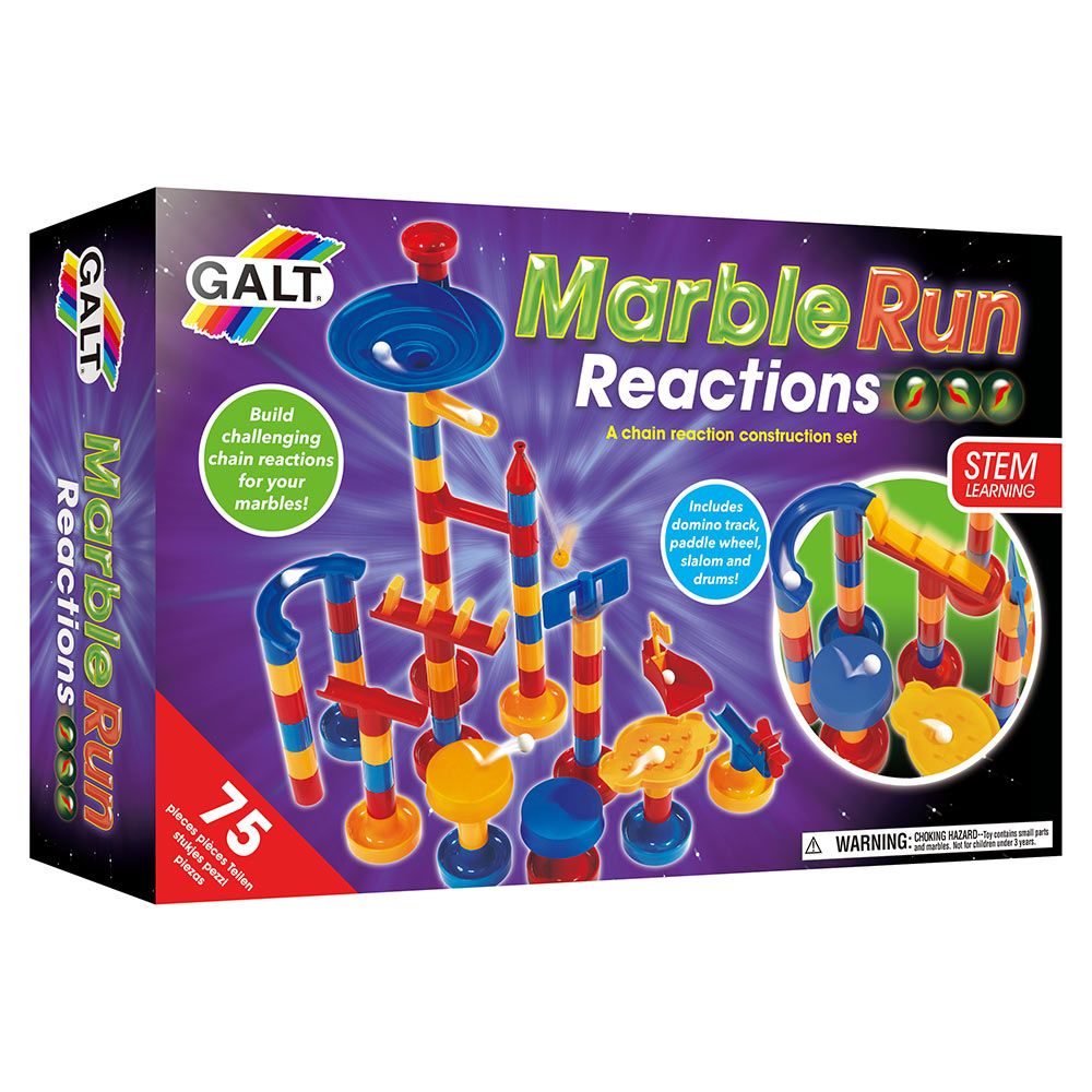 An exciting construction set using the ever-popular Galt Marble Run to create fascinating chain reactions! Challenge yourself to build a chain of fun obstacles for your marbles. Watch your marble swirl around the vortex, send paddle wheels spinning, knock over dominoes and jump from drum to drum to raise the finish flag! Marble Run Reactions is a hands-on way to learn about cause and effect and introduces forces and energy. Build on top of the chain reaction ideas sheet, following the numbered images to build each tower and obstacle. Once you have mastered the marble run, mix up the pieces and have hours of fun constructing your own chain reactions! Marble Run Reactions is fully compatible with all Galt Marble Runs.