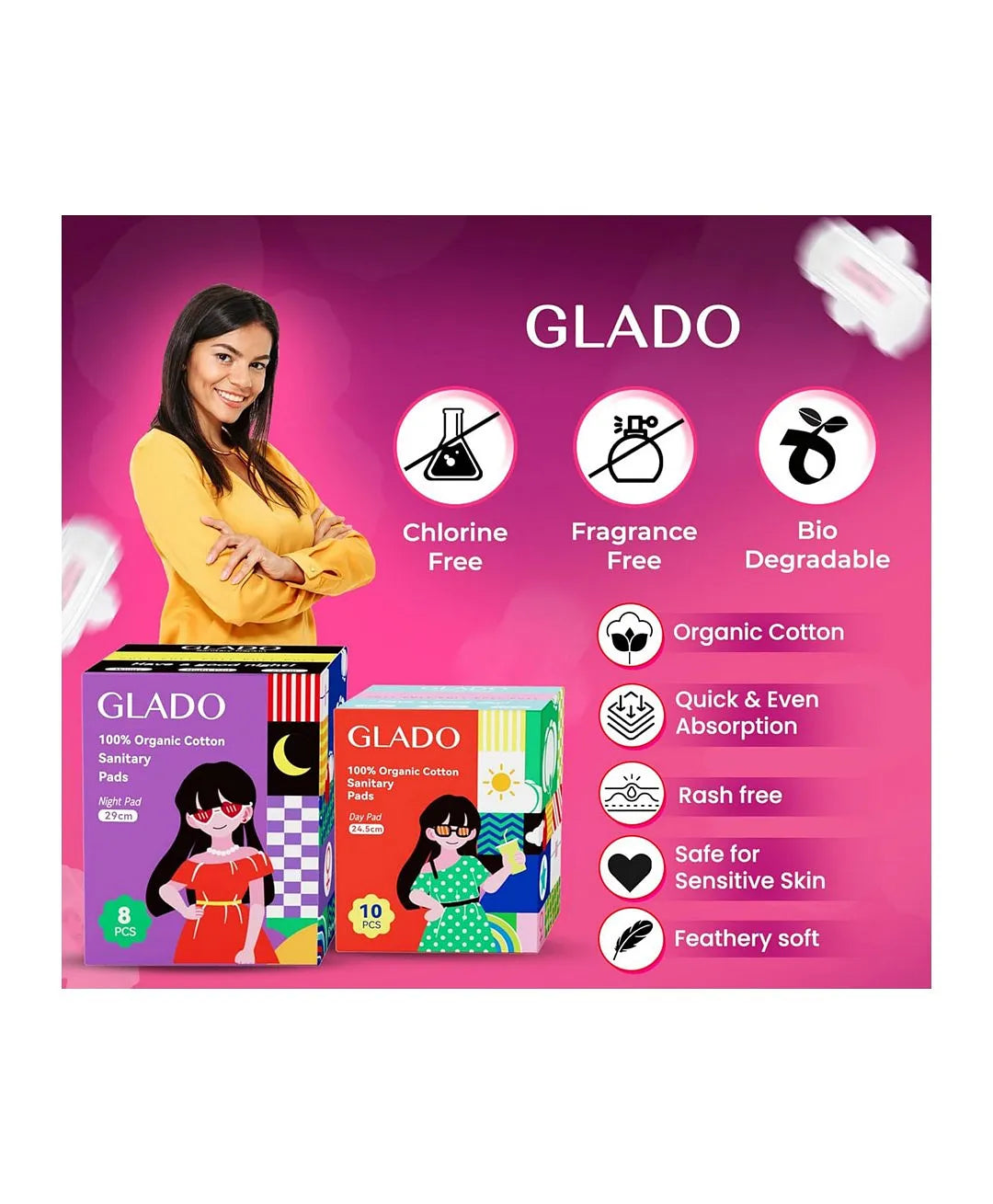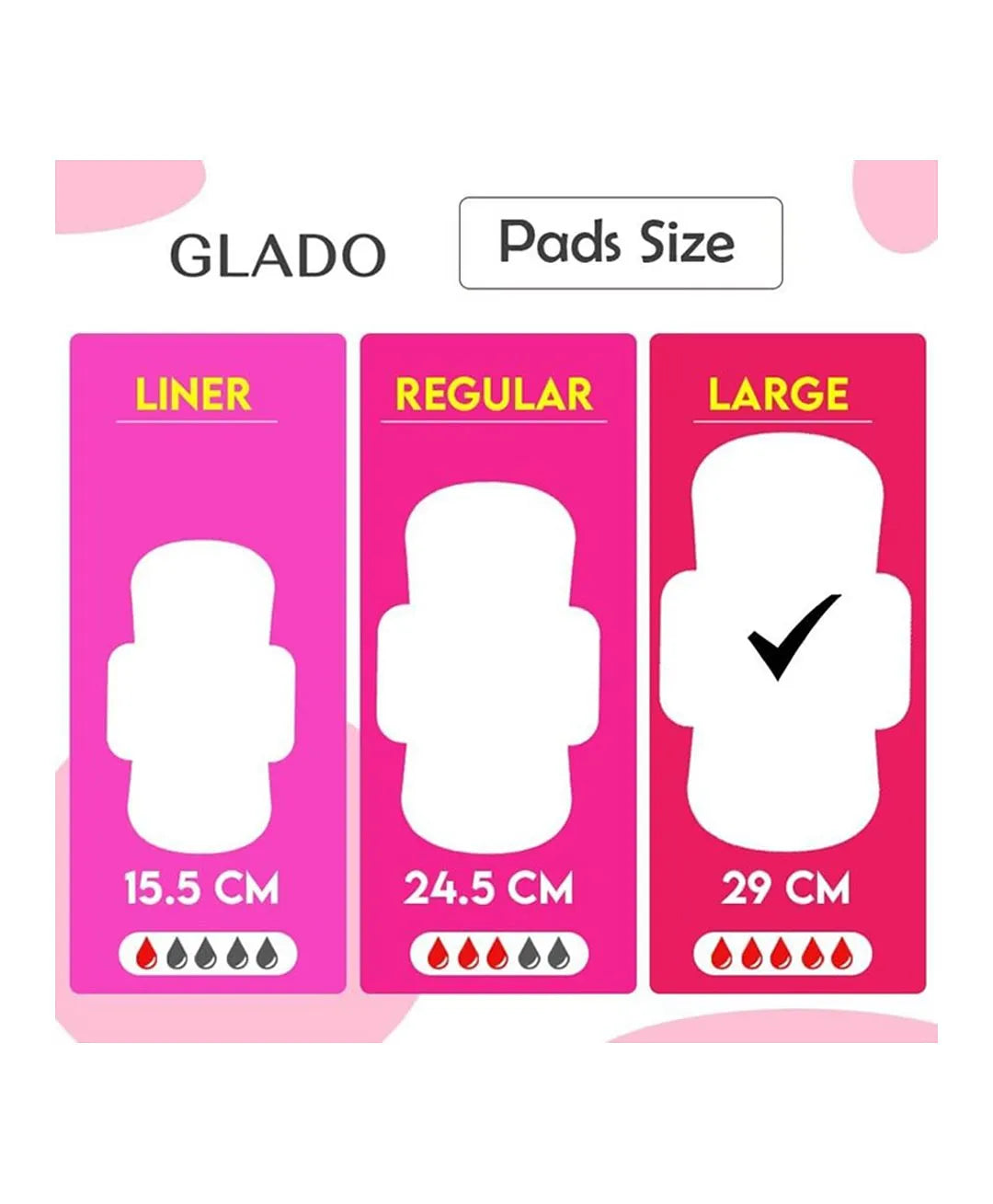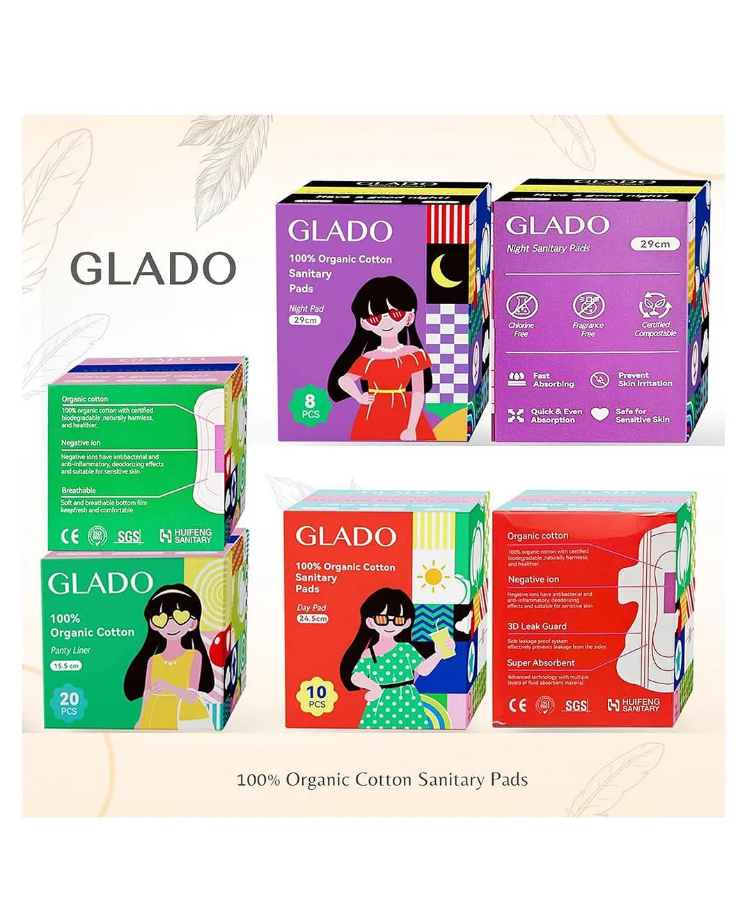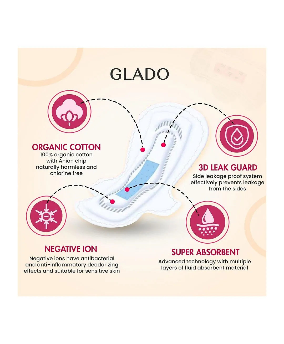 Glado 100% Organic Cotton Sanitary Napkins for Women, 8 Pcs (29cm) – Night Protection, Negative ion, 3D Leak Guard, Heavy Flow, Chlorine & Fragrance Free, Prevents Skin Irritation, For Sensitive Skin