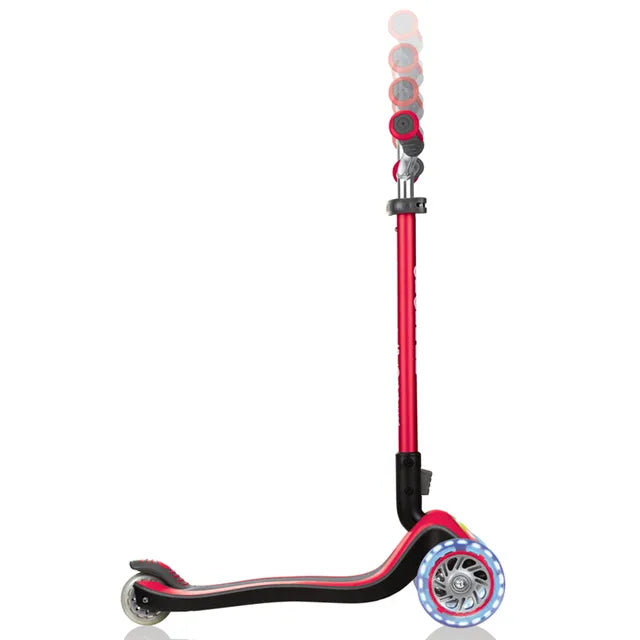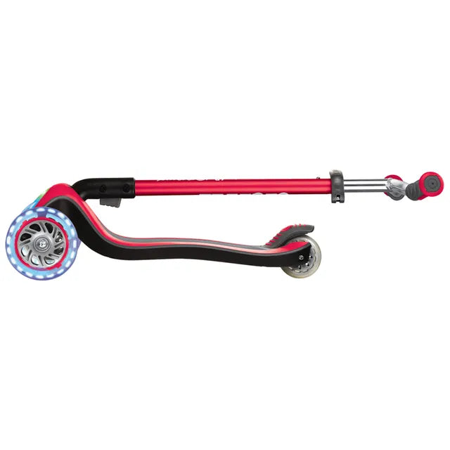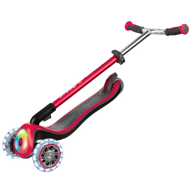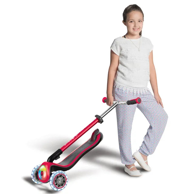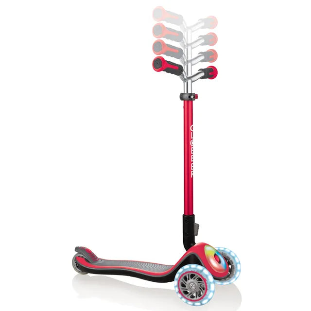 Elite deluxe 3-wheel scooter with a revolutionary folding system for children from three years. The scooter is equipped with bright luminous wheels and a luminous front platform - this is unlimited fun for your child! The scooter is ideal for developing balance and learning to ride your baby. Elite deluxe has a colored anodized v-shaped steering wheel, which is adjustable to 4 levels of height and easily adapts to the growth of the child.