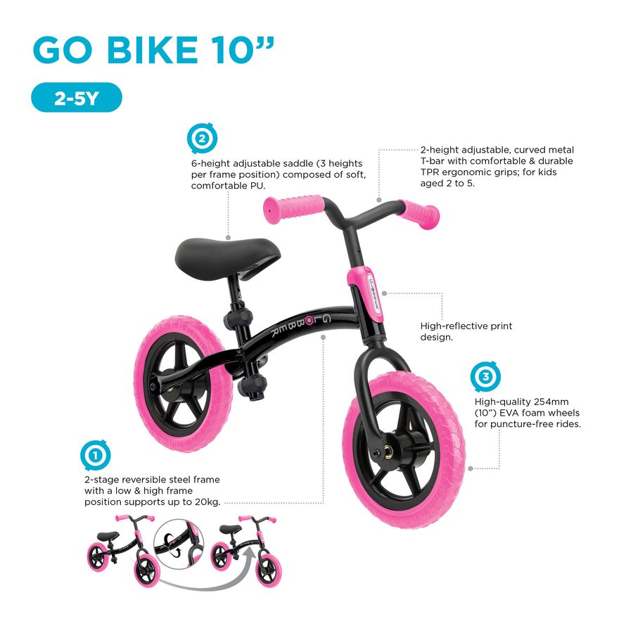 Have a blast and develop your little one's balance skills as they gradually ease into playtime on wheels! Go Bike balance bike for toddlers aged 2 to 5 years old is an innovative balance bike with a reversible balance bike frame for longevity, an 6-height adjustable saddle, 2-height adjustable, curved handlebars and high-quality 10" EVA foam wheels for maximum comfort!