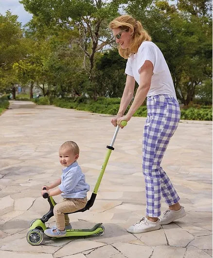 - All-in-one light-up foldable scooter with seat that transforms into a ride-on, walking bike, and toddler scooter. Ride-on and walking bike modes are designed for toddlers aged 15-36 months and scooter mode is for kids aged 3-9+.