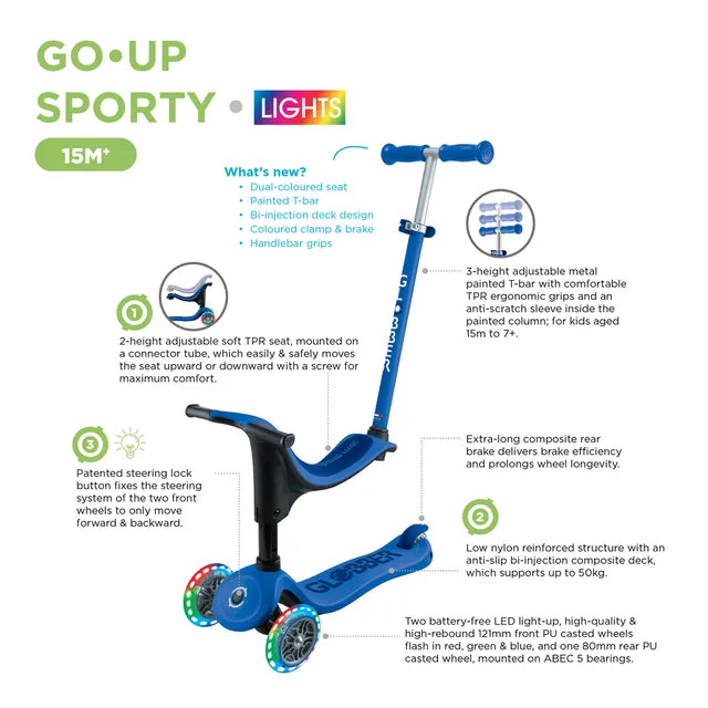 - Patented Steering Lock System - Teach those little feet to balance on a 3-in-1 scooter at your toddler’s pace. GO•UP ACTIVE LIGHTS has a patented steering lock system exclusive to Globber: The front wheels are fixed in a vertical to-and-fro movement, allowing your child to practice balance and gain confidence in scooting. Once they’re ready to ride, simply release the steering lock button so they can start turning the wheel and scoot on their own!