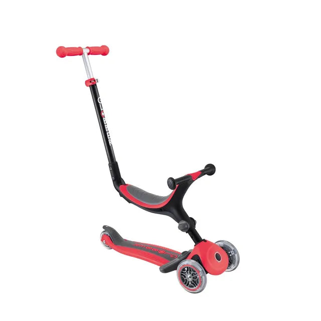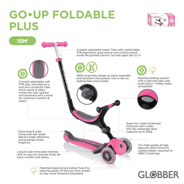 - Patented Steering Lock System - Teach those little feet to balance on a 3-in-1 scooter at your toddler’s pace. GO•UP FOLDABLE PLUS has a patented steering lock system exclusive to Globber: The front wheels are fixed in a vertical to-and-fro movement, allowing your child to practice balance and gain confidence in scooting. Once they’re ready to ride, simply release the steering lock button so they can start turning the wheel and scoot on their own