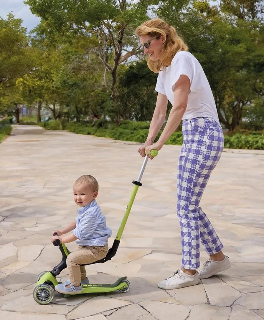 Globber's GO UP SPORTY LIGHTS the ultimate 3-wheel foldable scooter with illuminating lights and a seat for toddlers and kids. This innovative scooter transforms effortlessly into a ride-on, walking bike, and toddler scooter, catering to various play preferences. Designed for toddlers aged 15-36 months in ride-on and walking bike modes, while ideal for kids aged 3-7+ in scooter mode. Enjoy endless playdates with this trusted companion, designed to accompany your child for years to come!