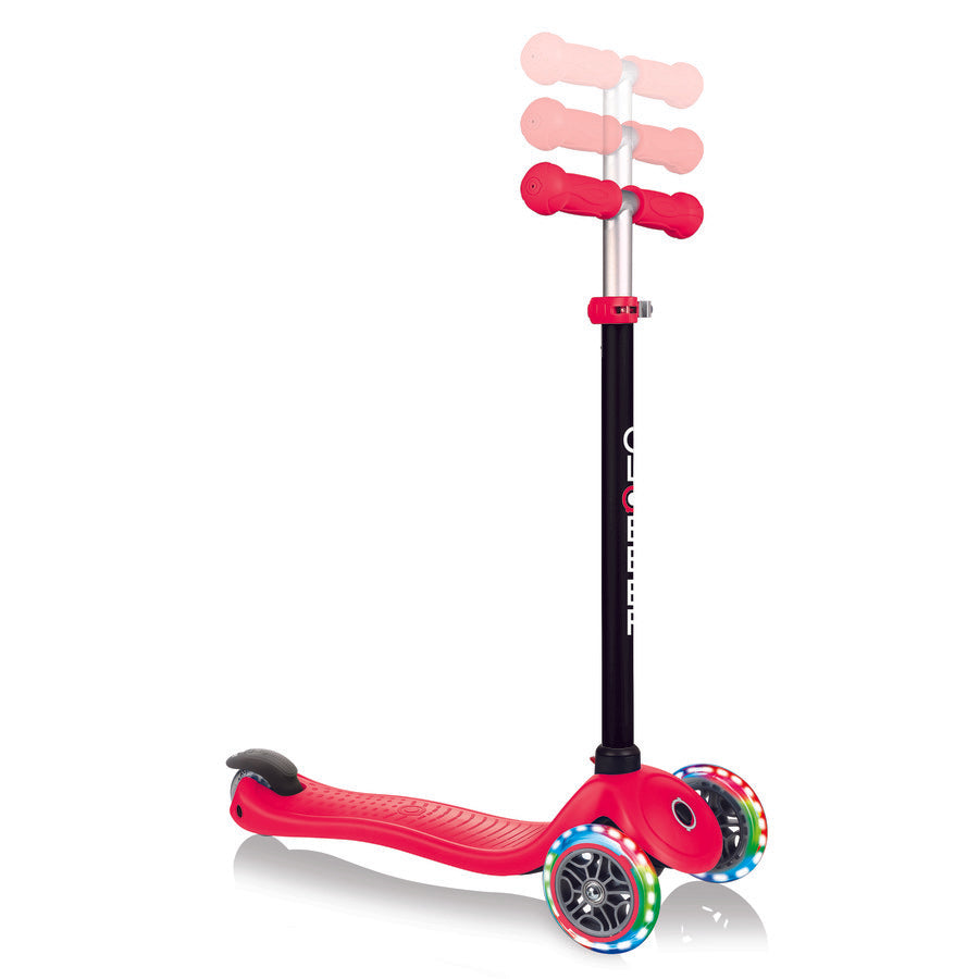 - Adjustable Comfort Customizable light-up scooter with seat boasts a 2-height adjustable TPR seat (23.9cm or 27.4cm from the ground) and a 3-height adjustable T-bar (67.5cm, 72.5cm, 77.5cm from the ground) for comfortable rides