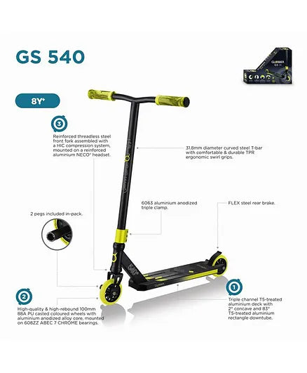 Ready to advance your freestyle scootering skills? GS 540 is a complete stunt scooter inclusive of two pegs for a wider range of freestyle scootering stunts. Equipped with high-quality and durable components, such as a robust triple channel aluminium deck, threadless fork and NECO headset, PU-casted stunt scooter wheels with aluminium anodized alloy core, stunt scooter pegs, and a FLEX steel rear brake, GS 540 trick scooter for kids and growing teens is the best choice for strong and stable shreds at the skatepark