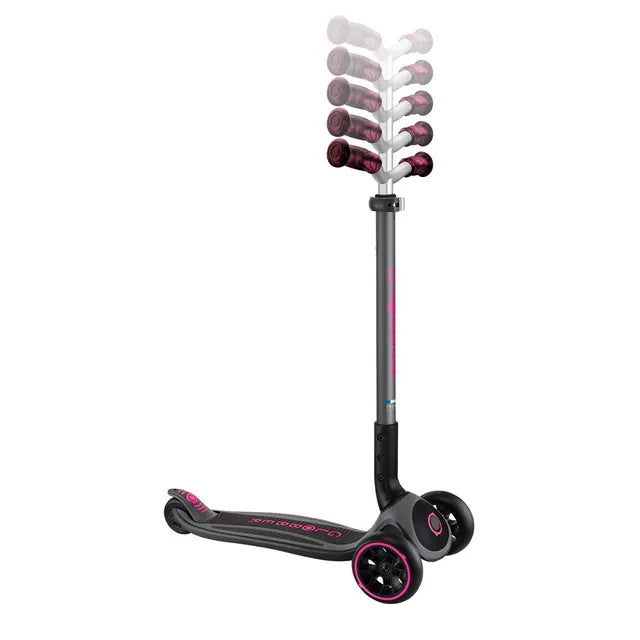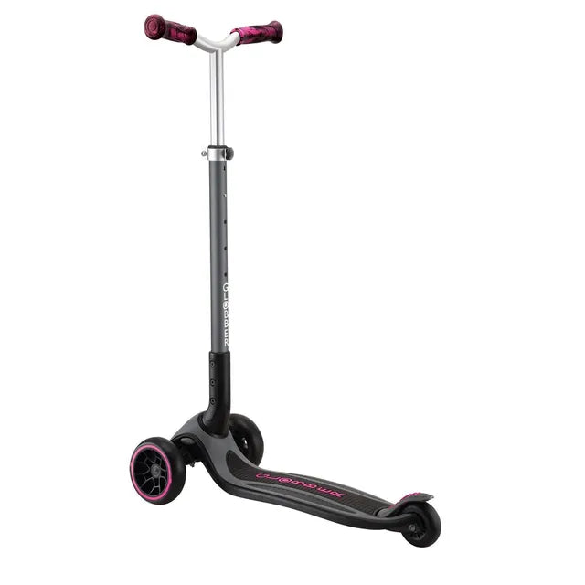 - Patented Steering Lock System - Master balance on your large 3-wheel kick scooter! Globber’s patented steering lock system fixes the two front wheels in a locked vertical movement. Once you’ve mastered balance and are ready to scoot, simply unlock the button to enable lean-to-steer riding