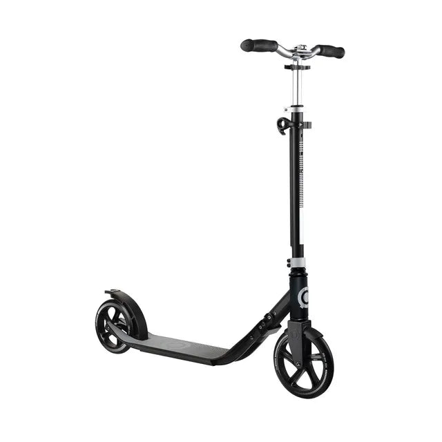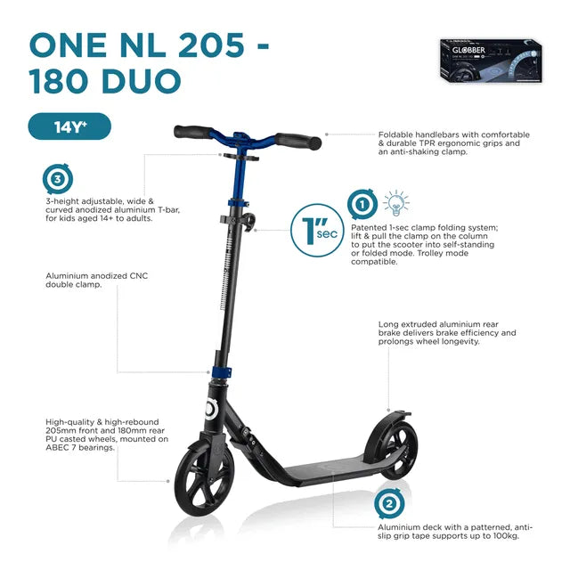 ONE NL 205-180 DUO comes with a wide aluminium deck, a 3-height adjustable aluminium T-bar, foldable handlebars, and 205mm and 180mm scooter wheels for the perfect ride in the city