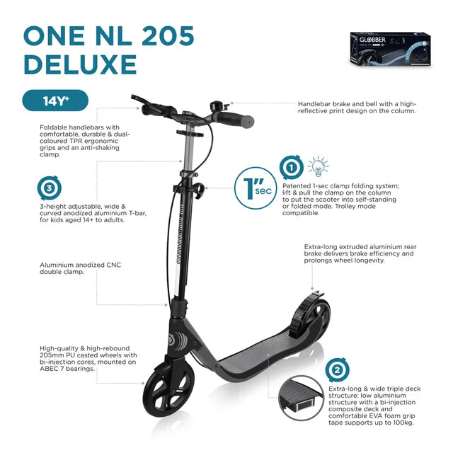 Globber ONE NL 205 Adult Scooters have the exclusive & patented 1-second folding system, making it simple to fold & easily carry while on-the-go. Thanks to the one-second folding system on the pole, adults no longer have to awkwardly bend down to fold a scooter. Simply lift and pull the clamp, and the scooter will automatically go into the self-standing mode and down into trolley mode. The simple lift-and-pull folding system on the pole, is easily assembled and stored away. With the triple-reinforced deck finished with padded EVA foam and 205 mm PU wheels, ONE NL 205 is extremely comfortable to ride for hours