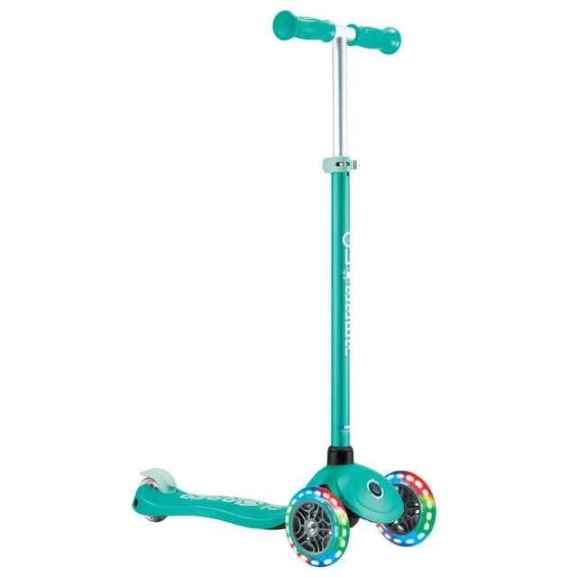 - Adjustable T-Bar: Globber's Primo Plus Lights 3-wheel scooter with lights comes with an extra T-bar height from the original 3-height T-bar found on Primo scooters. The 4-height adjustable aluminium painted T-bar (67.5cm, 72.5cm, 77.5cm, or 82.5cm) provides an even longer-lasting scooter companion for kids-because it grows as they do!