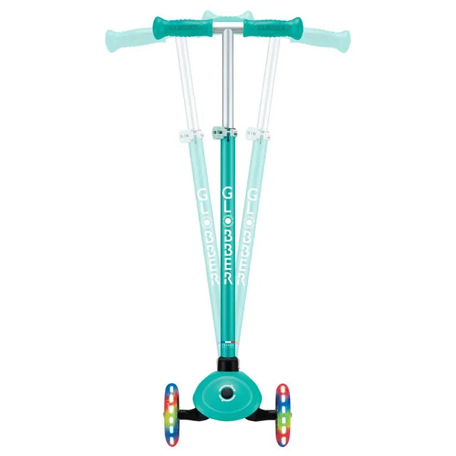 - Patented Steering Lock System: Primo Plus Lights has a patented steering lock system exclusive to Globber - The front wheels of the light-up scooter can be fixed in a forward-and-backward movement, allowing your child to practice balance and gain confidence. Once they're ready, simply release the steering lock button so they can start turning the wheel and burning the track!