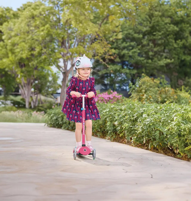 Scoot all day with a 3-wheel ride that ticks all the boxes for your little scooting champ - Primo Plus Lights! Packed with functional features, this 3-wheel scooter with lights is the best-valued choice for your child. A 3-wheel scooter with lights equipped with a 4-height adjustable T-bar, patented steering lock system, LED light-up wheels, and a low bi-injection deck design.