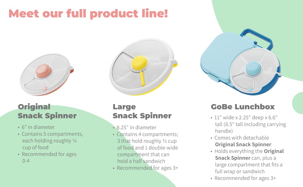 - Safe: The Gobe Large Snack Spinner is made with only BPA, PVC, and Phthalate free materials, the safest materials for your little ones. With a leak-resistant seal, the Large Snack Spinner is perfect for a day full of adventuring (and snacking)!