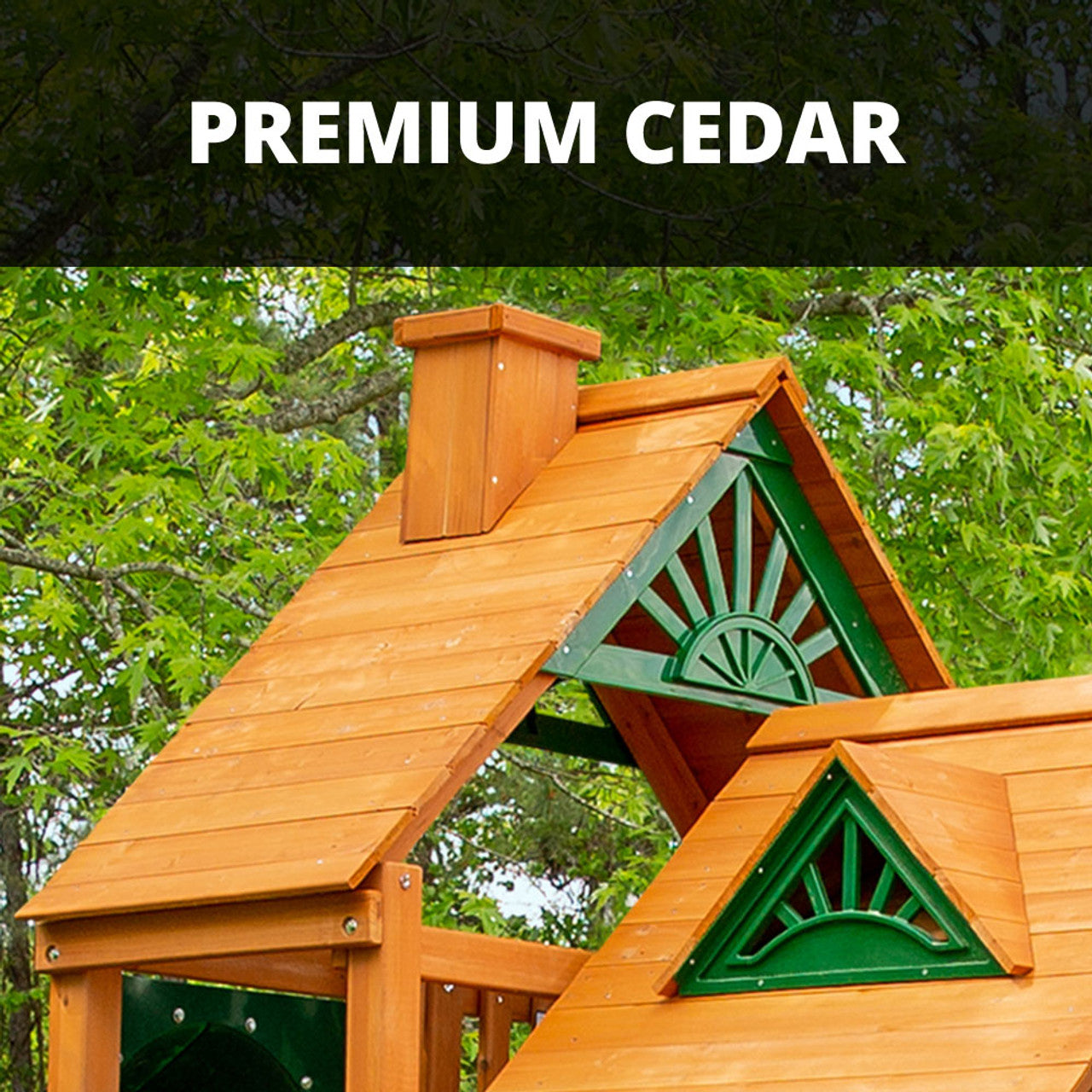 The clatter bridge and tower help make this the swing set of many kid's dreams! It's packed with fun activities like the 360 degree Turbo Tire Swing, Deluxe Rope Ladder, climbing ramp and rock wall. Select from our wood roofs or green vinyl canopy.