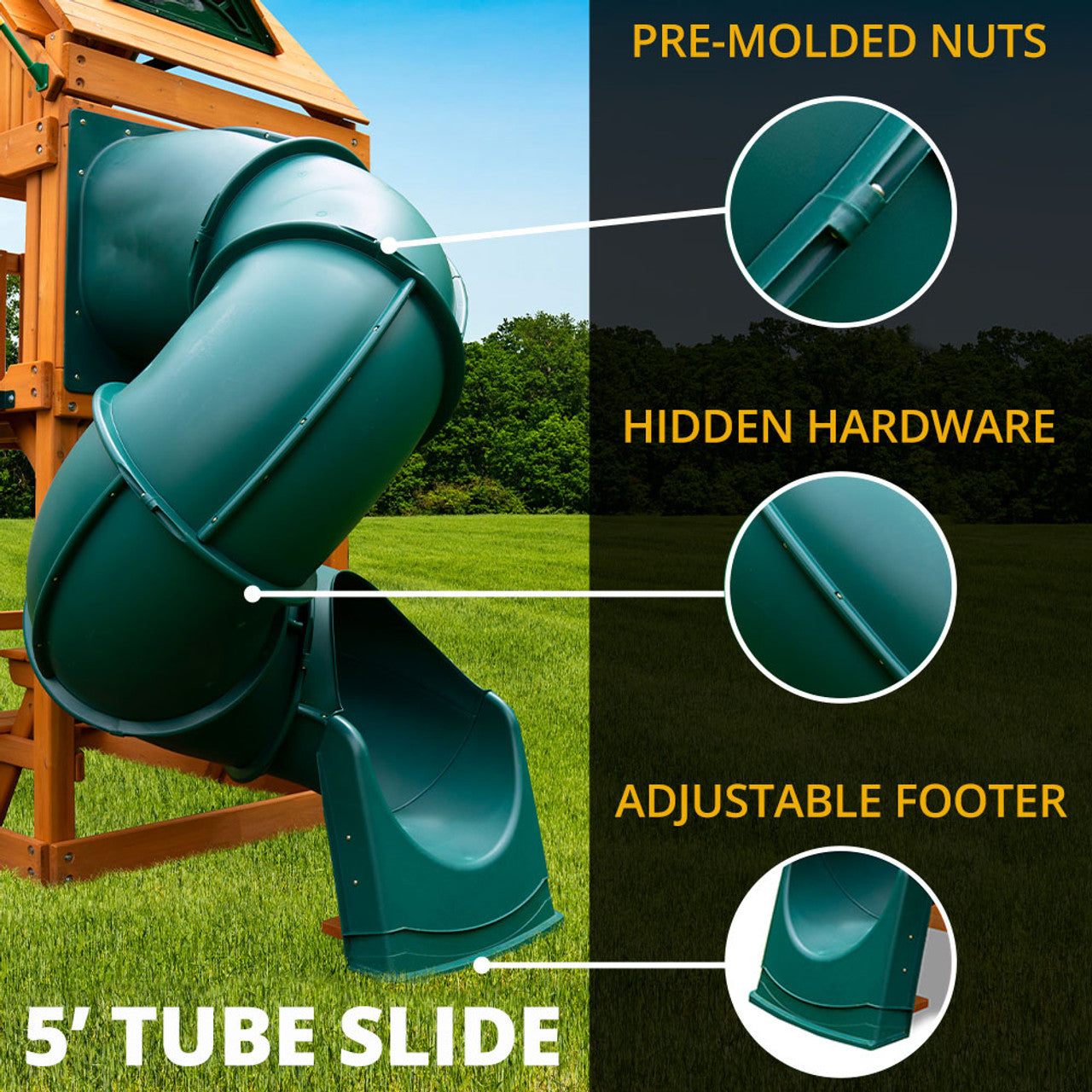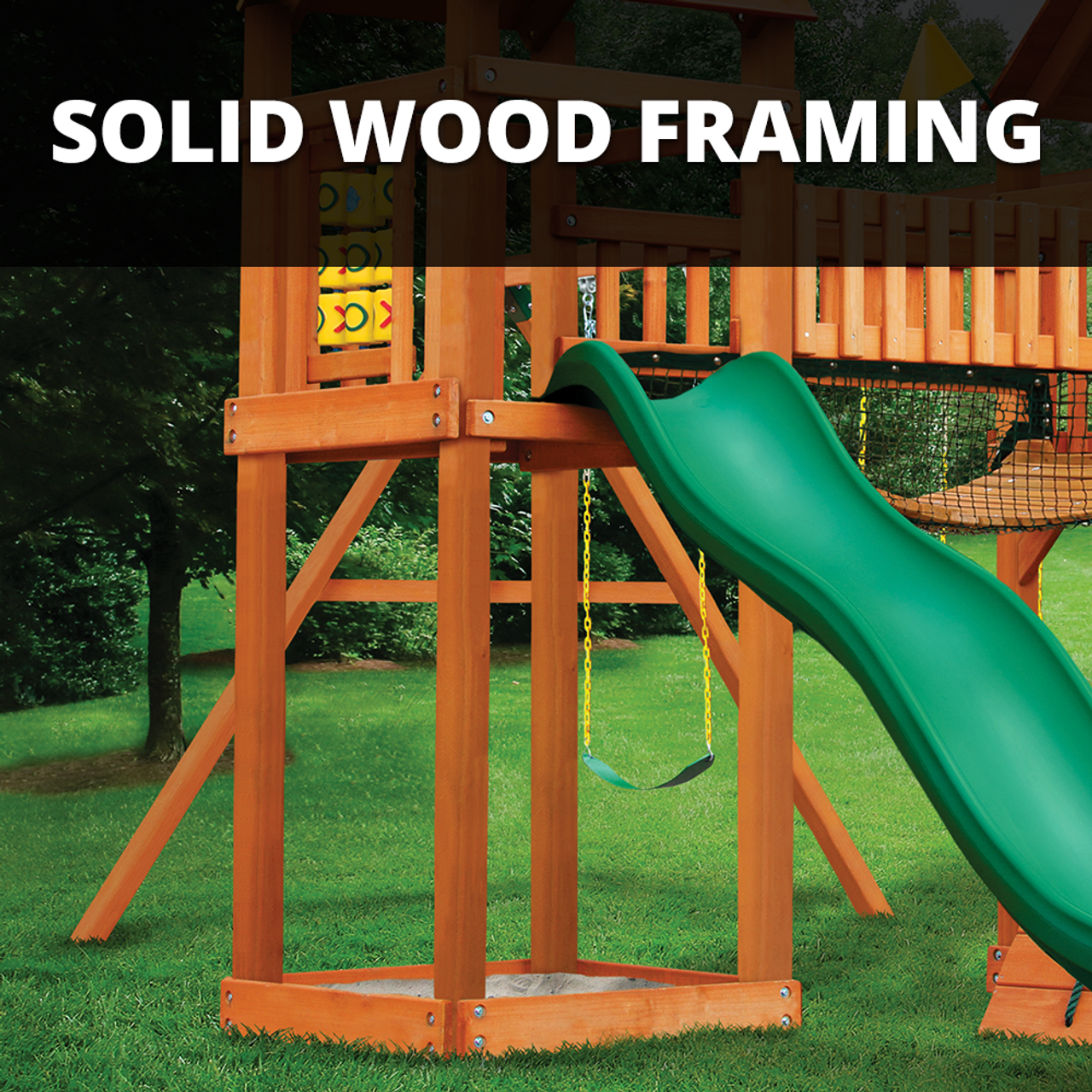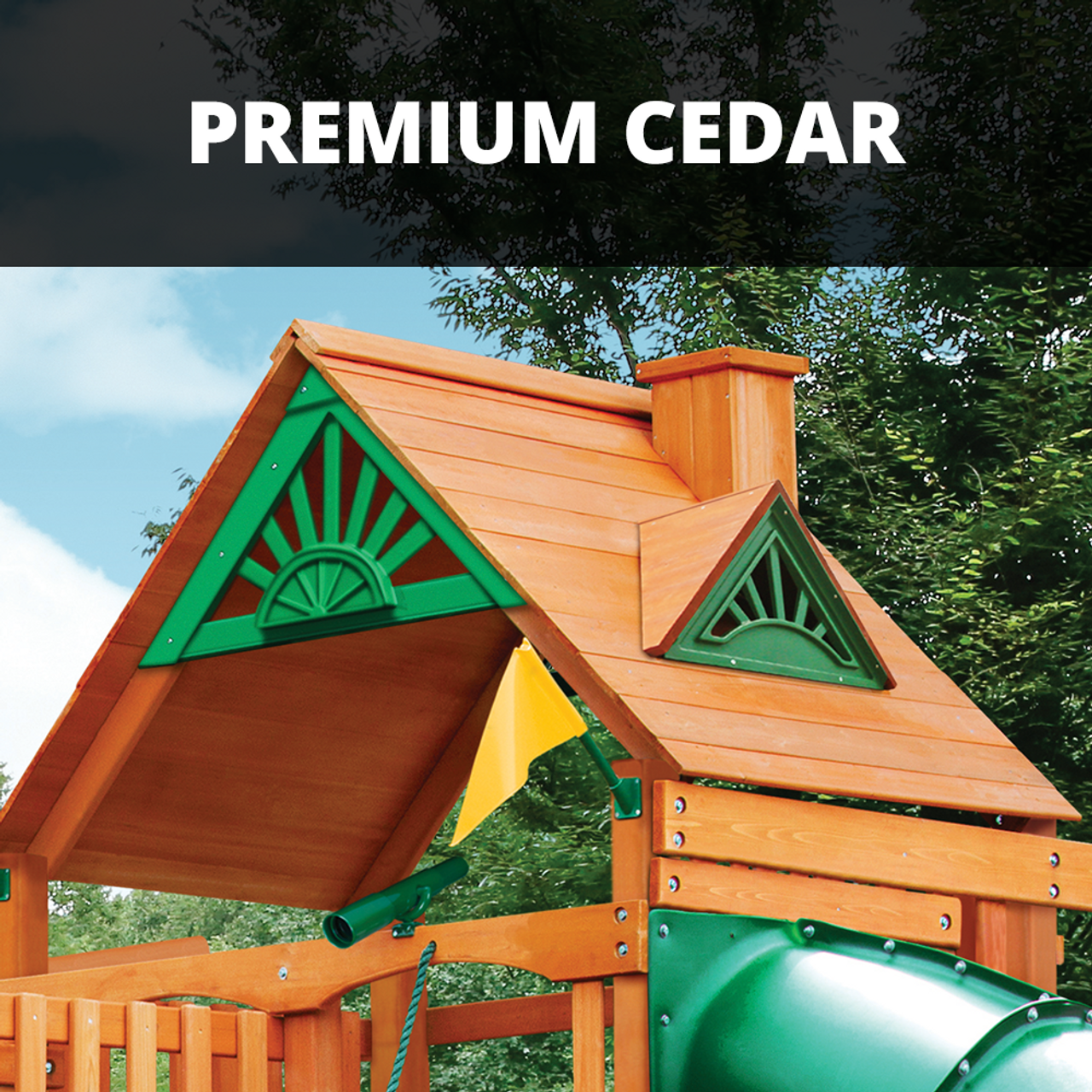 Ready, Set, Go! The Extreme Tube Slide II and clatter bridge take the Wilderness Gym over the finish line of excitement. Kids love the Alpine Wave Slide, large play deck, rope ladder and rock wall. Select from our wood roof options - one includes a Treehouse Add-On!