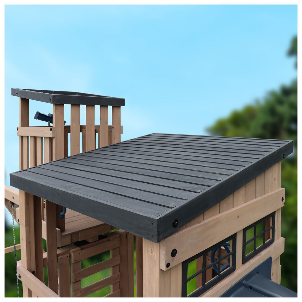The Skyline Lookout Outdoor Playset by Gorilla Playsets transforms backyards into a hub of fun and imagination with its sleek, contemporary design. It's an ultimate playset that combines playtime excitement with modern aesthetics, suitable for modern homes. Children can enjoy various activities like exploring a lookout tower, climbing a rock wall, swinging, and sliding down a tube or wave slides. Its unique, minimalist design not only complements any backyard but also becomes a focal point for social gatherings and creating lasting memories.