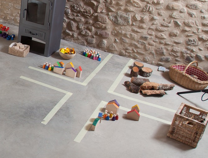 This material can be used as a symbolic game, to create stories and small worlds. Creating stories, inventing new cities, towns, streets… These houses, painted with the colours of the rainbow and which are simple and natural, give a cosy and colourful neighbourhood. Children can create the most surprising small worlds in a representative game that, along with loose pieces, can be versatile and open-ended.