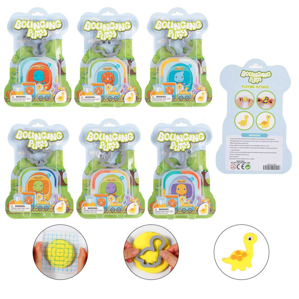 What's Included: 30-32G (8Gx4 Colors) Bouncing Putty Into Pot With 1Pc Dino Mold And 4Pc